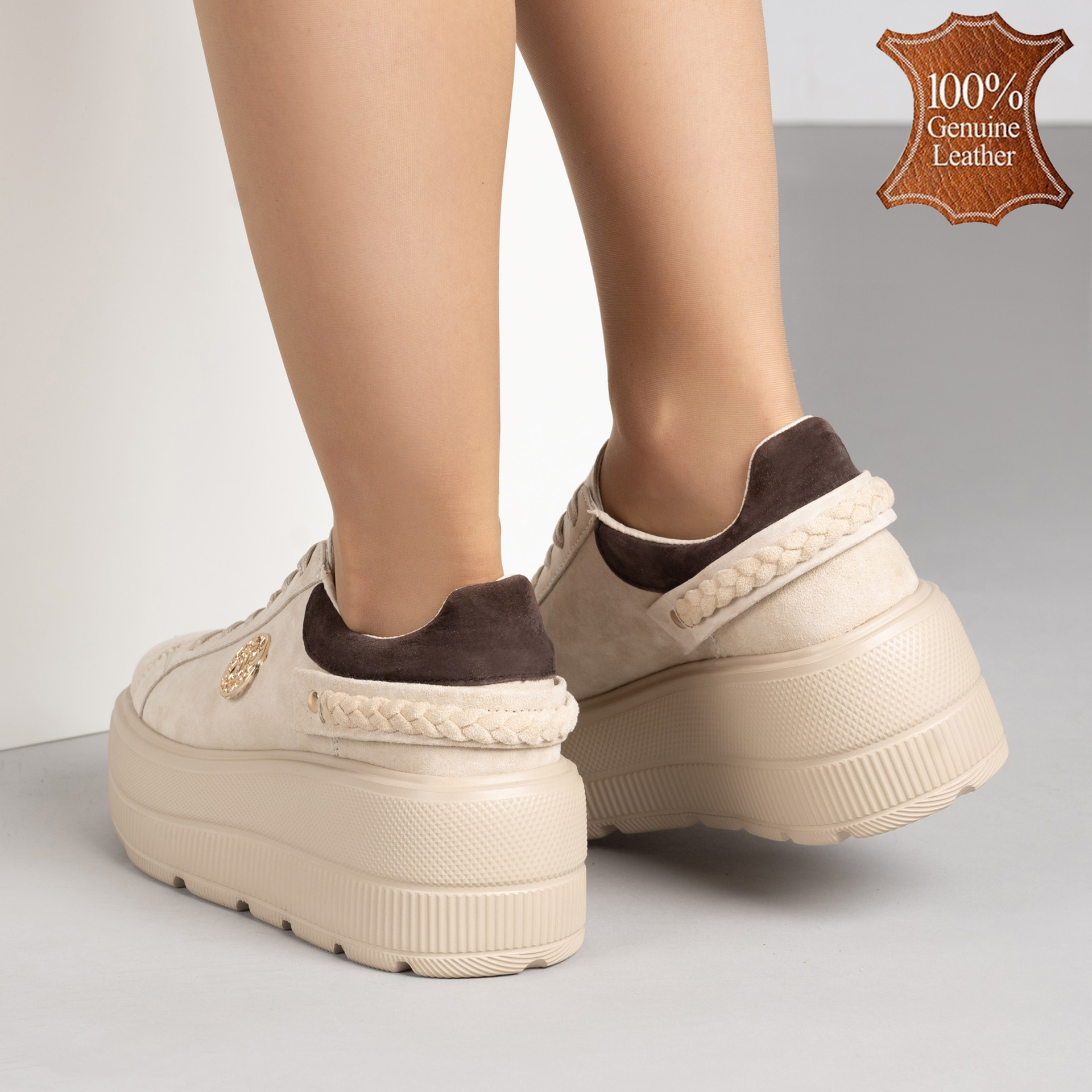 Ако търсиш обувки, които са толкова удобни, че може да забравиш, че ги носиш, но и толкова стилни, че да спечелиш всяка улица, то тези бежови велурени кецове с лека платформа са твоята нова тайна суперсила. Естествената кожа ги прави меки като пухче, а коженият хастар ти обещава комфорт, който може би никога преди не си усещала. И нека не забравяме елегантния златист детайл – защото кой каза, че кецовете не могат да са и малко бляскави? Повиши нивото на ежедневния си стайлинг с тази доза класа и мекота!