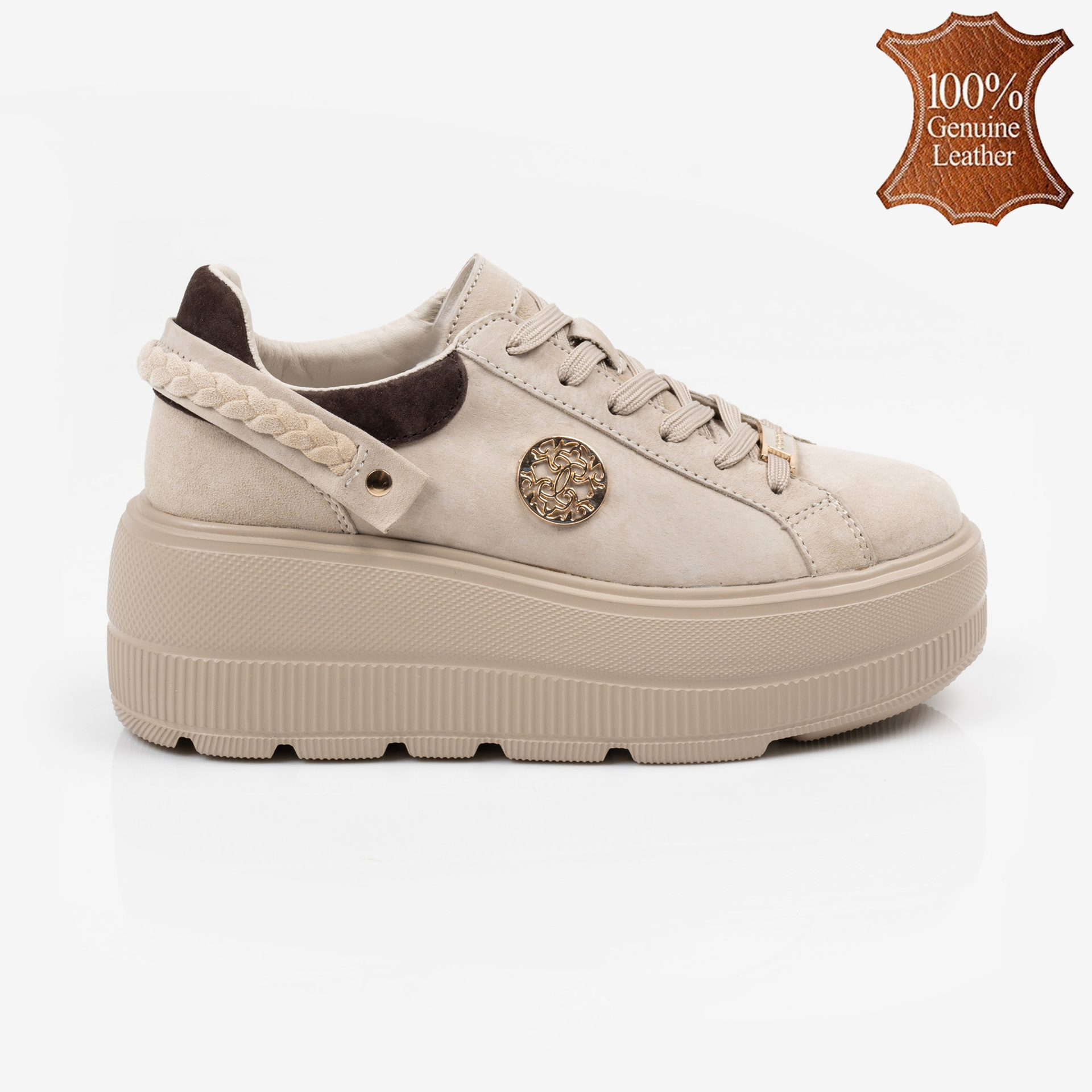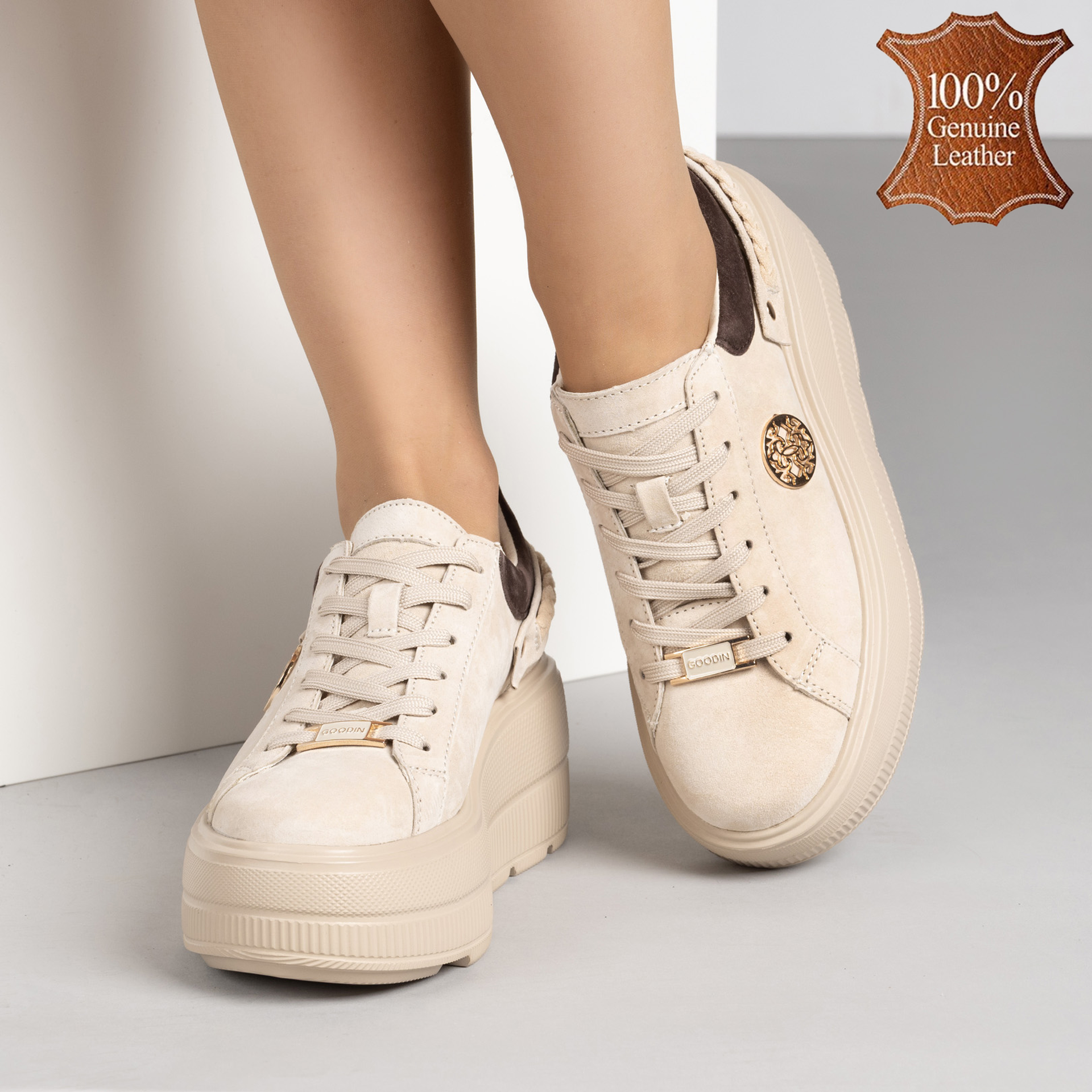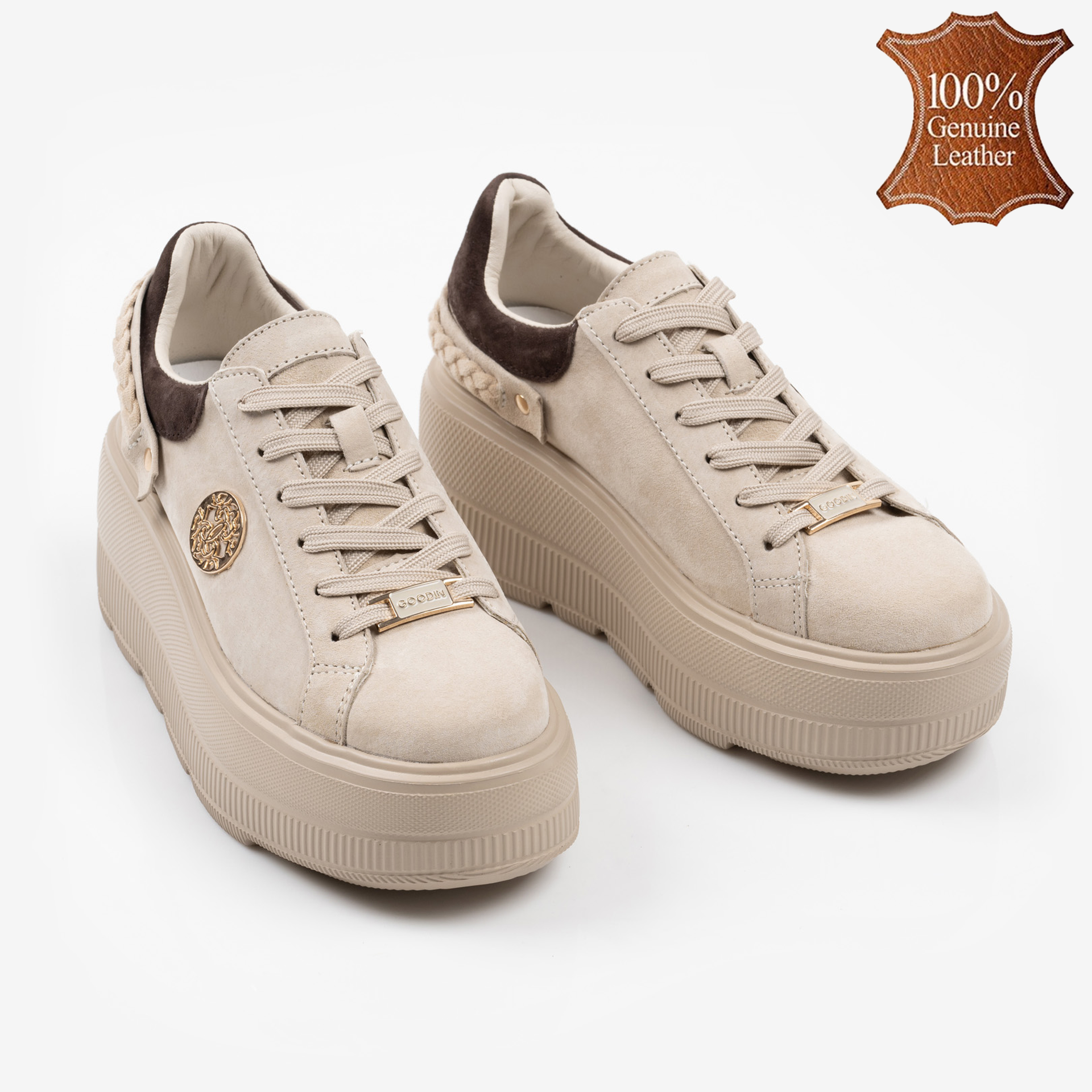 Бежови дамски велурени кецове с лека платформа и елегантен златист детайл