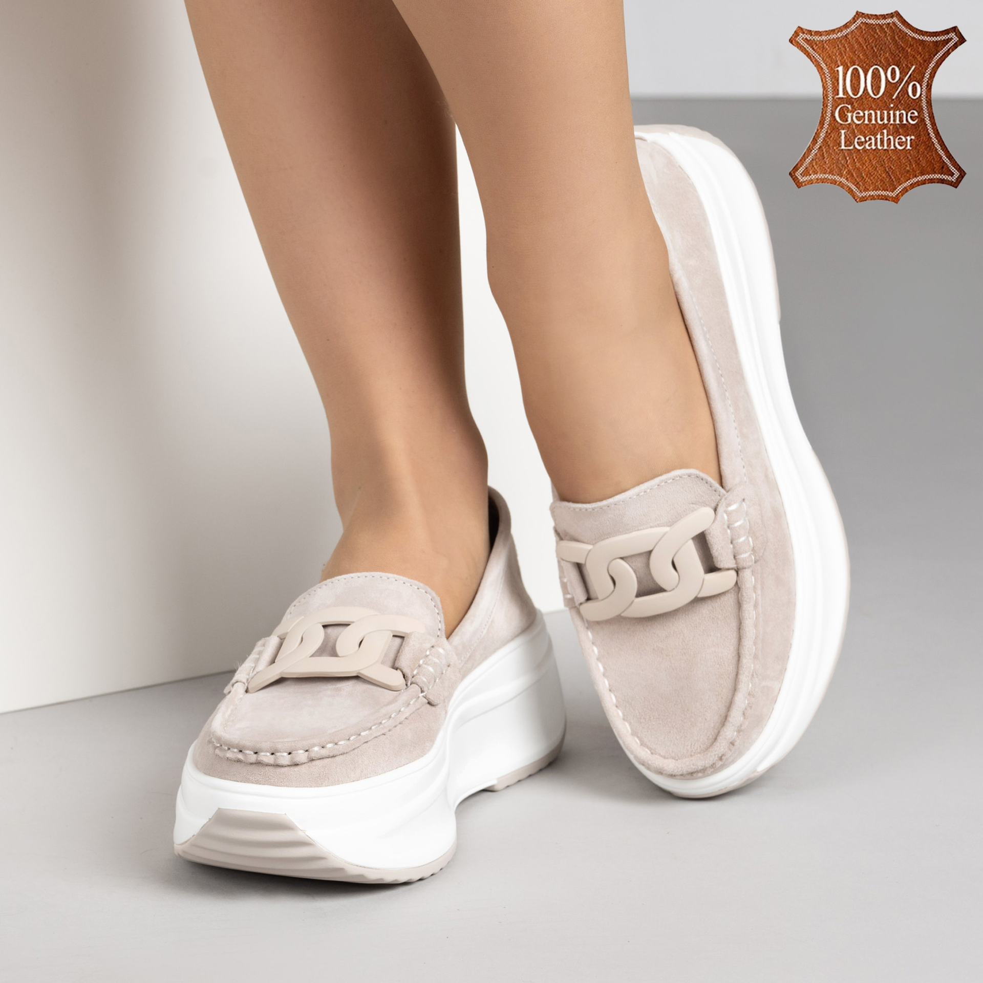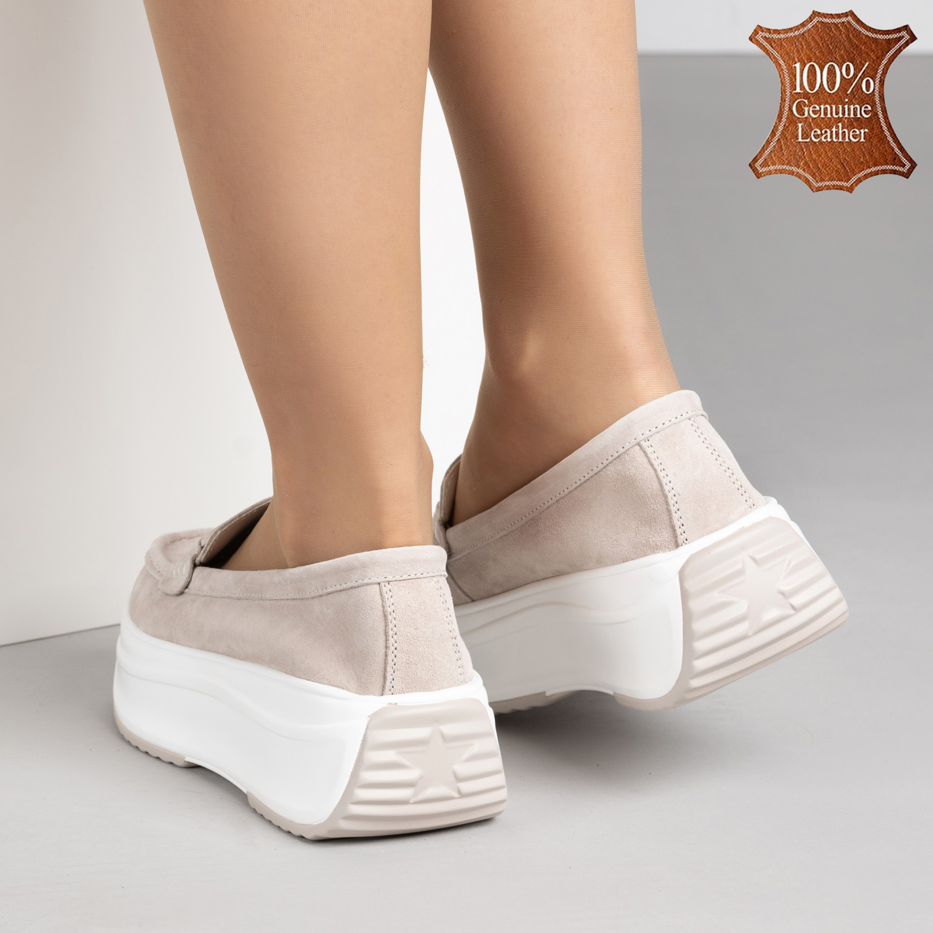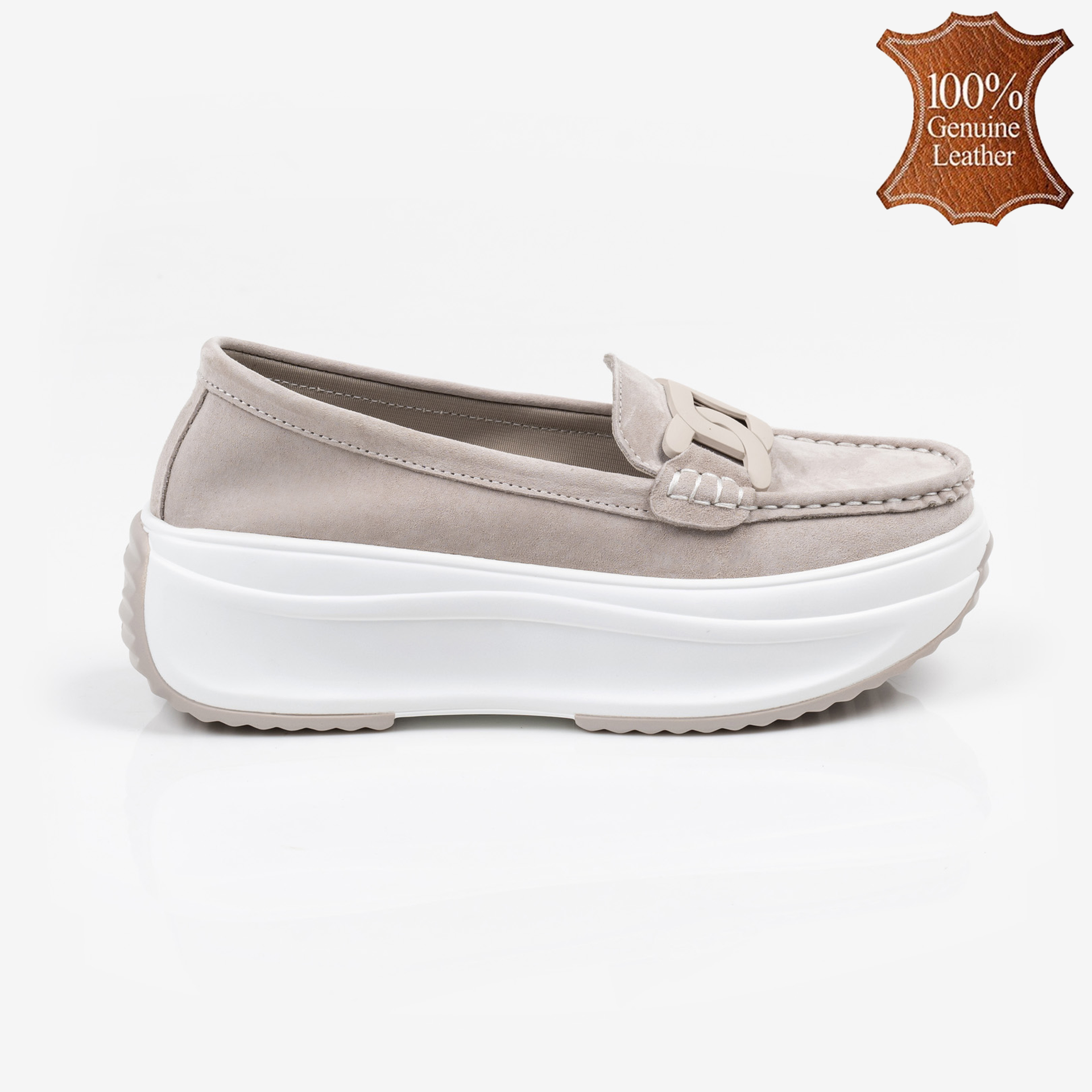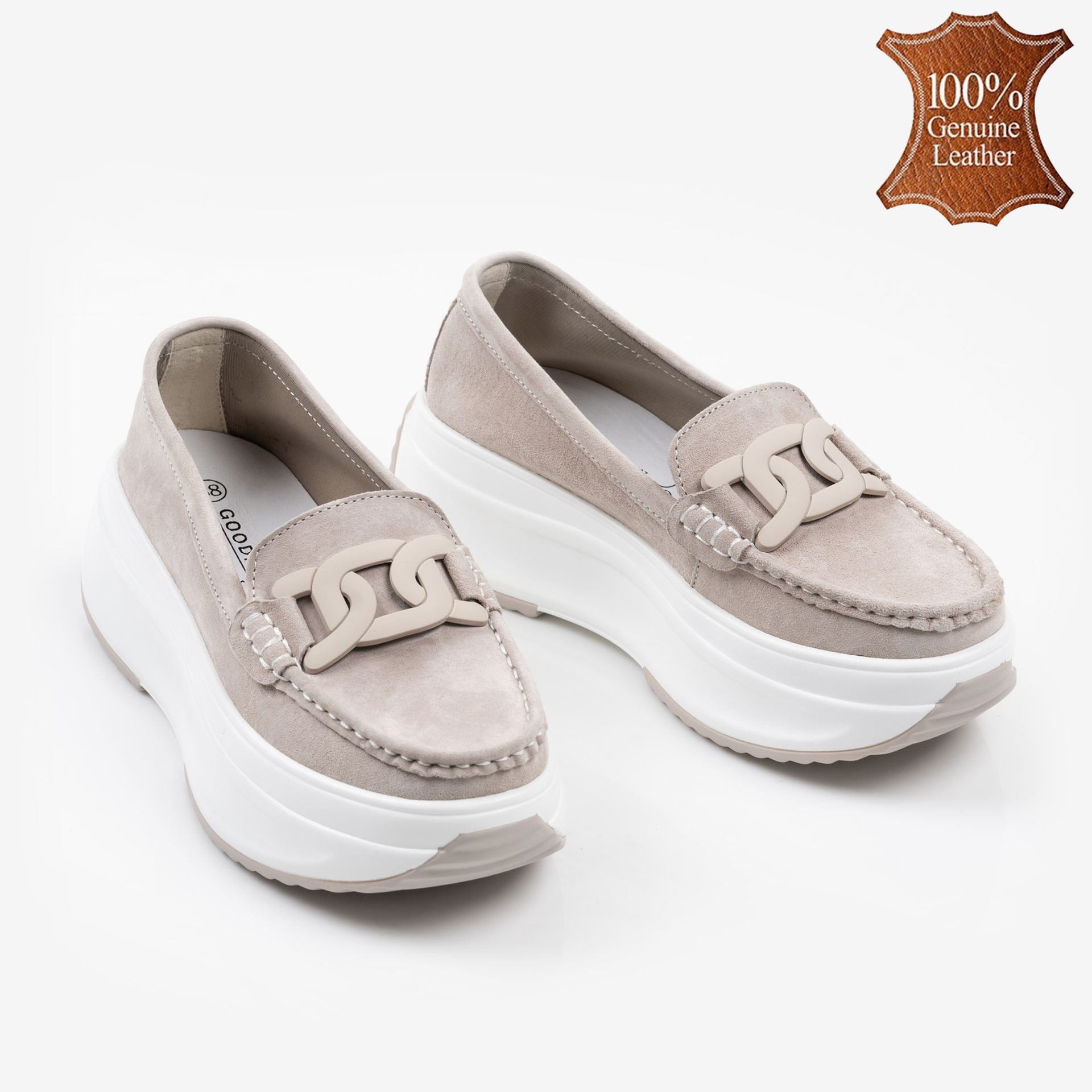 Ако търсите обувки, които да са толкова удобни, че ще забравите, че ги носите, но също така да придават на краката ви малко допълнителен ръст, то тези бежови мокасини от естествен велур ще се превърнат в новия ви любим аксесоар. Платформата им е като малка тайна за височина, а мекотата на 100% естествения велур кара ходенето да се усеща като разходка по облаците. Идеални са, ако искате да сте стилни и на крак с удобството – защото животът е по-хубав, когато можеш да хвърчиш на обувки!