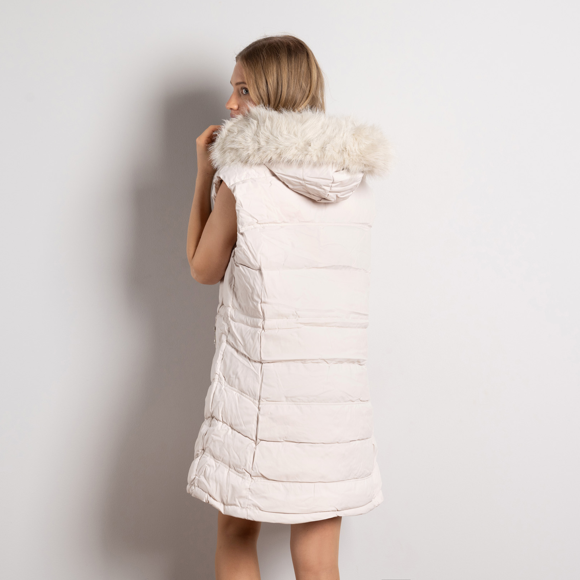 Бежово дамско ватирано елече – модерен модел с махаща се качулка