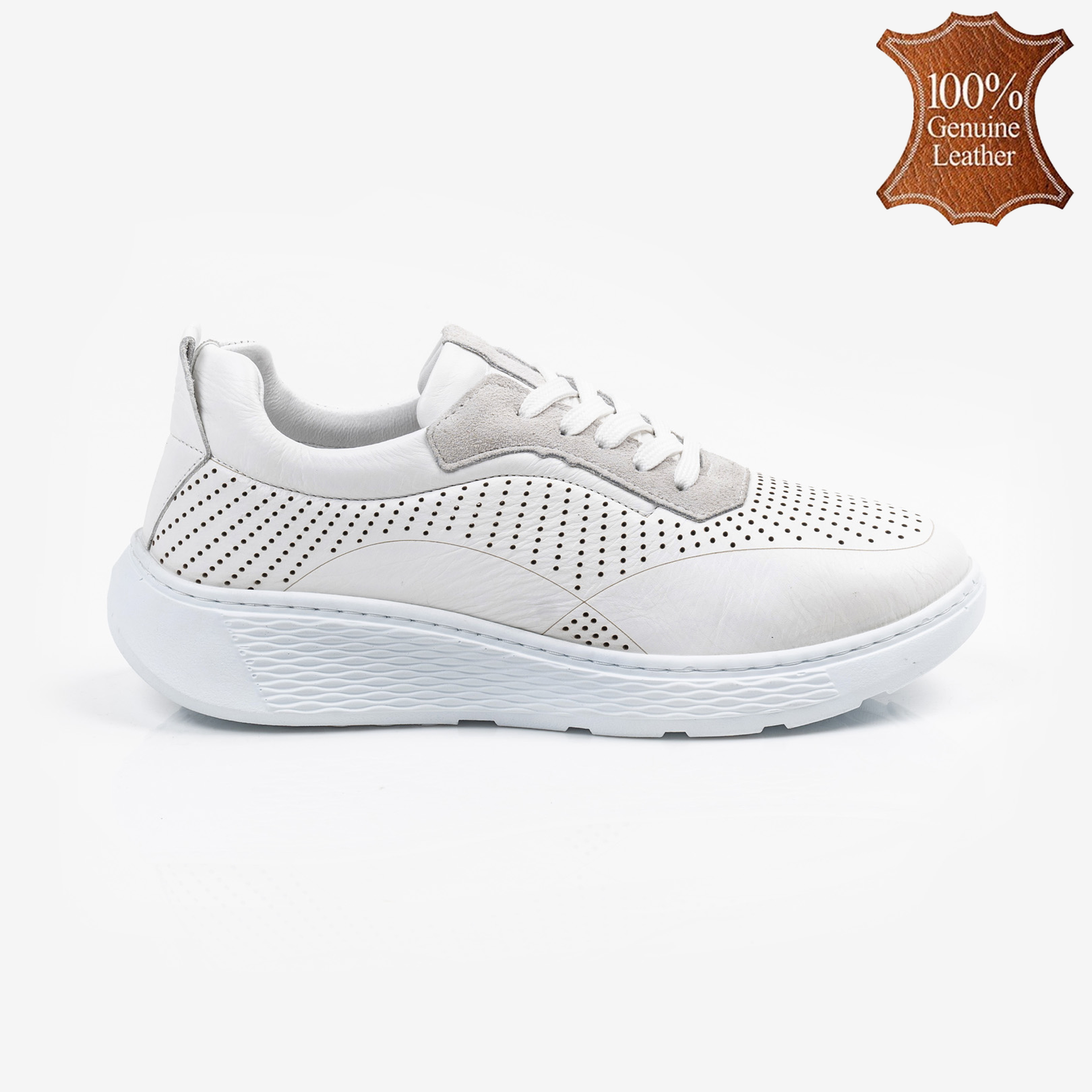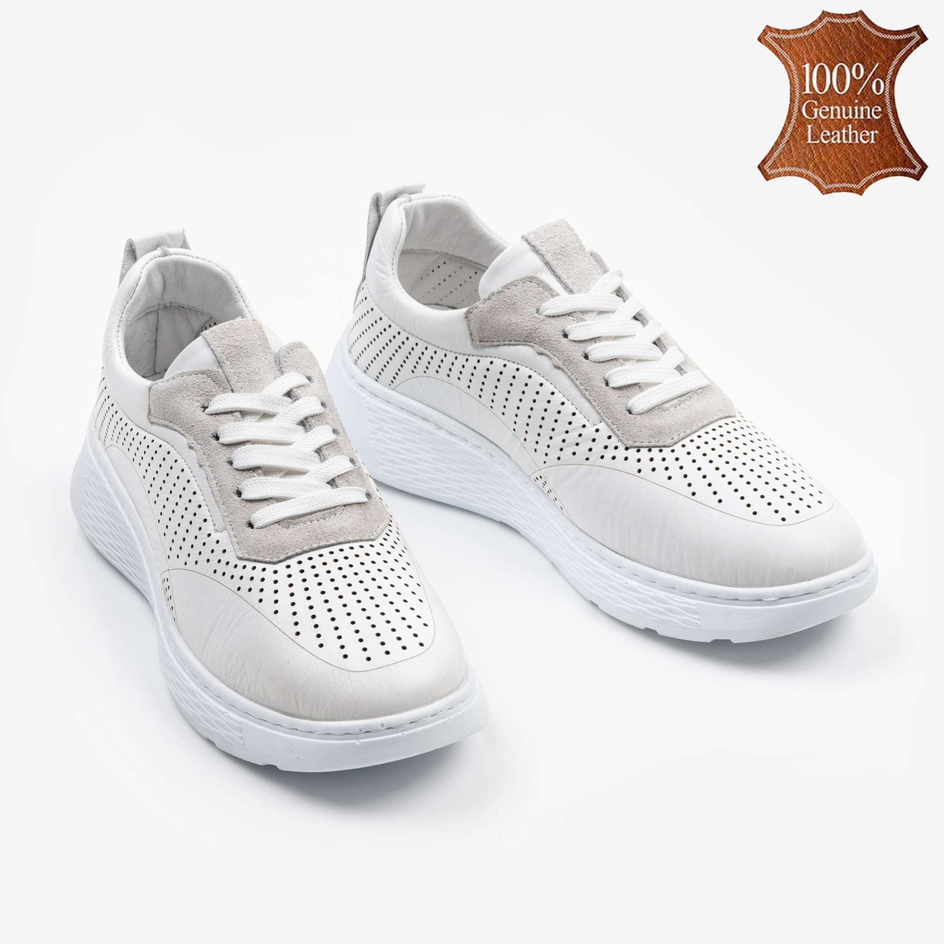 Бели дамски кожени маратонки с перфорация и шита олекотена подметка