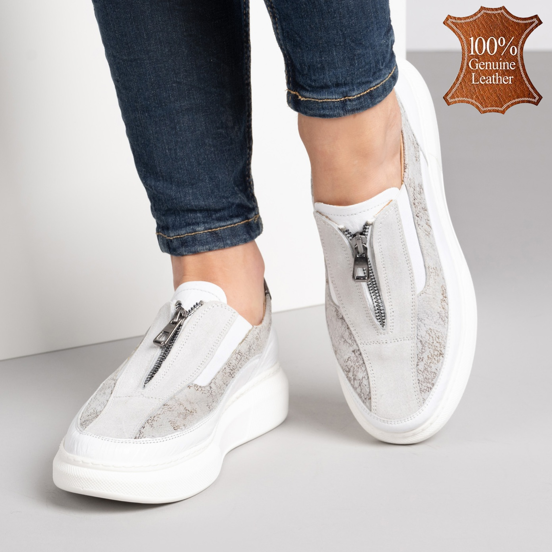 Бели дамски обувки от естествена кожа с модерна апликация от кожа на олекотено ходило с шита подметка с цип