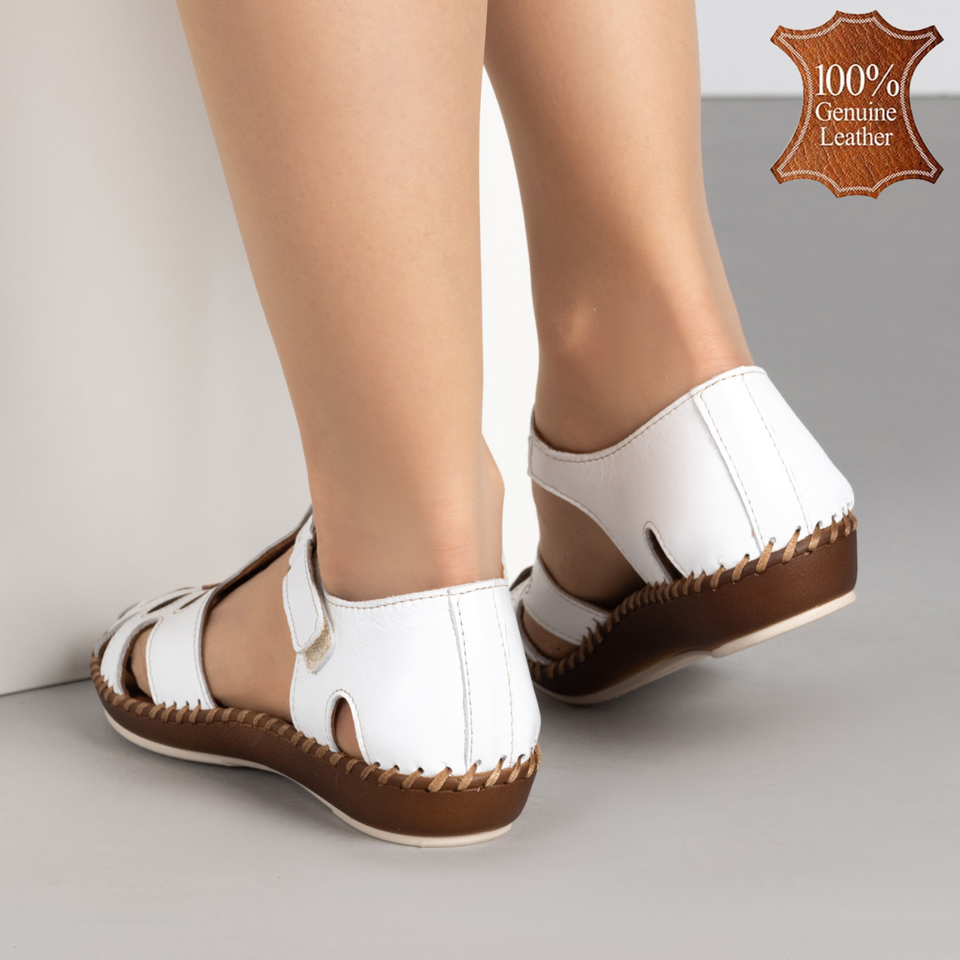 Дамски летни обувки от естествена кожа с перфорация и лепенка – бял