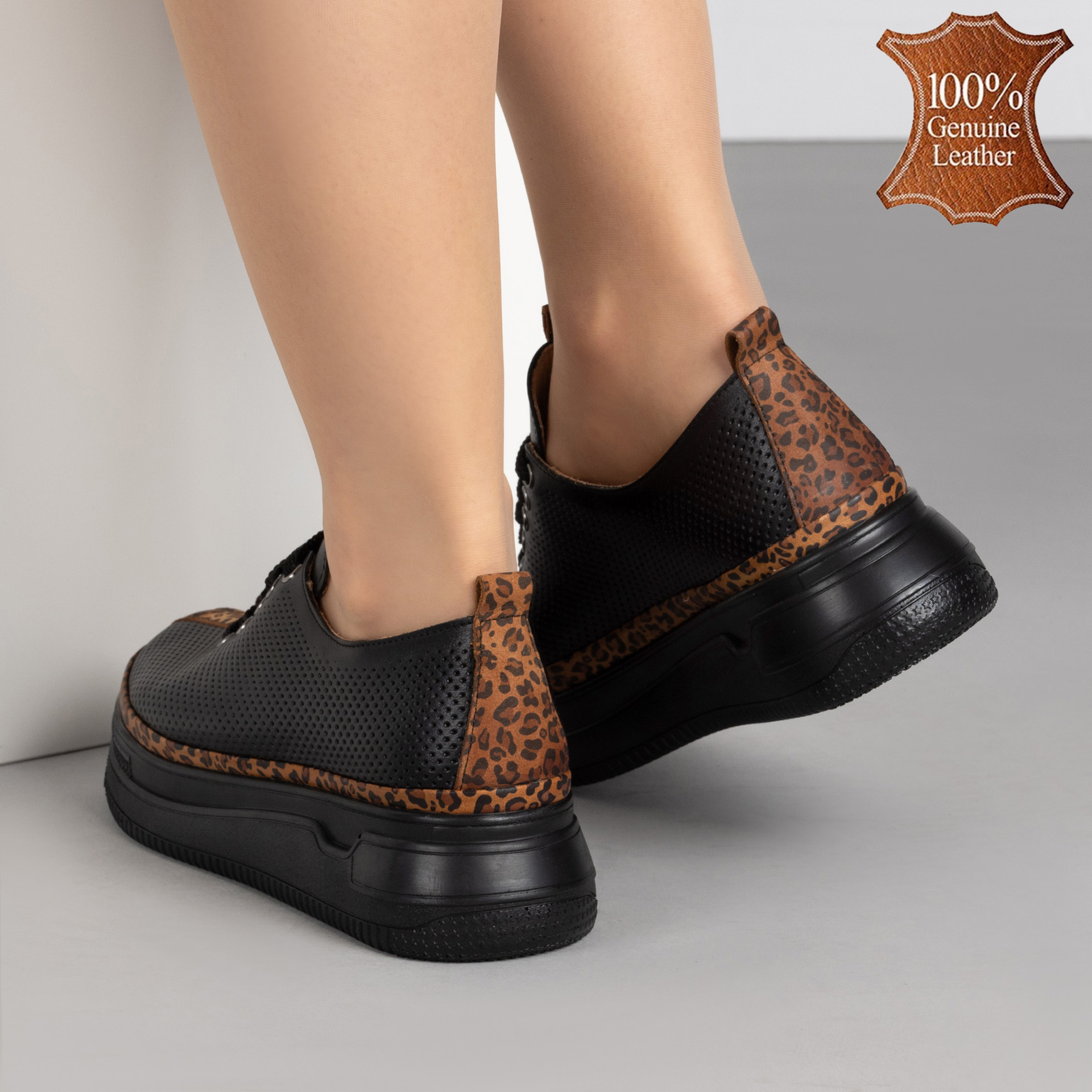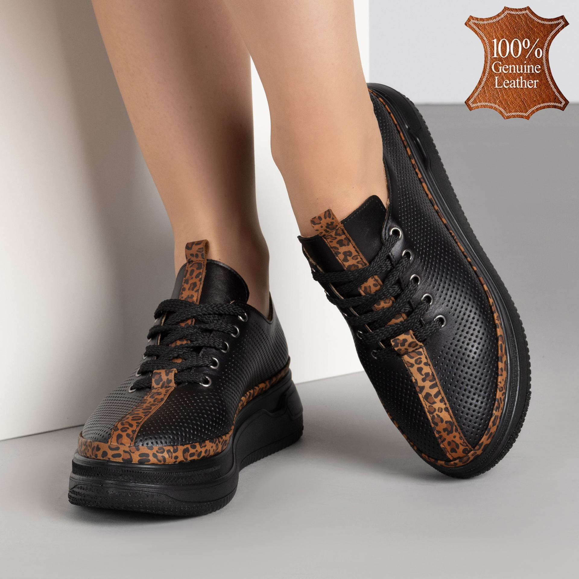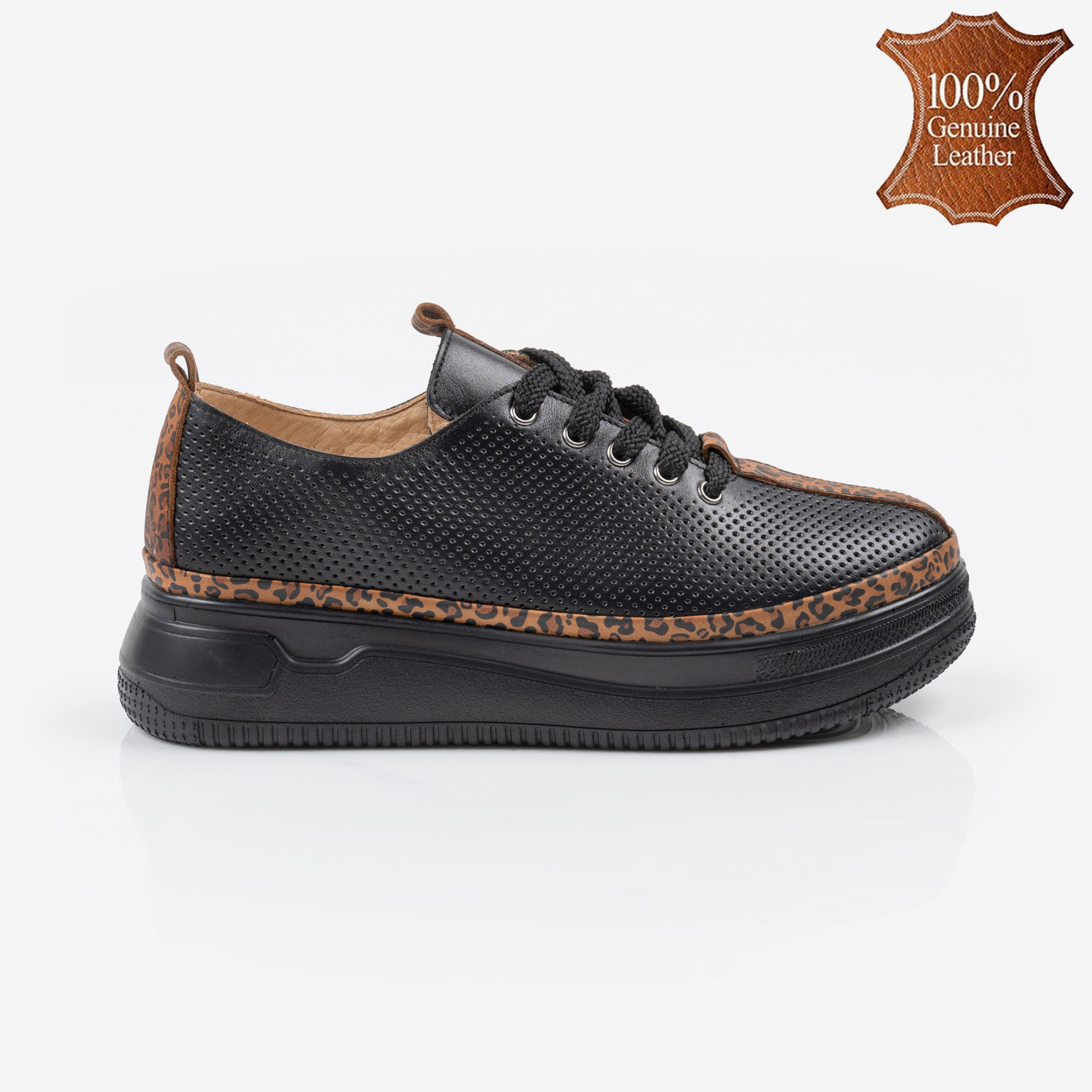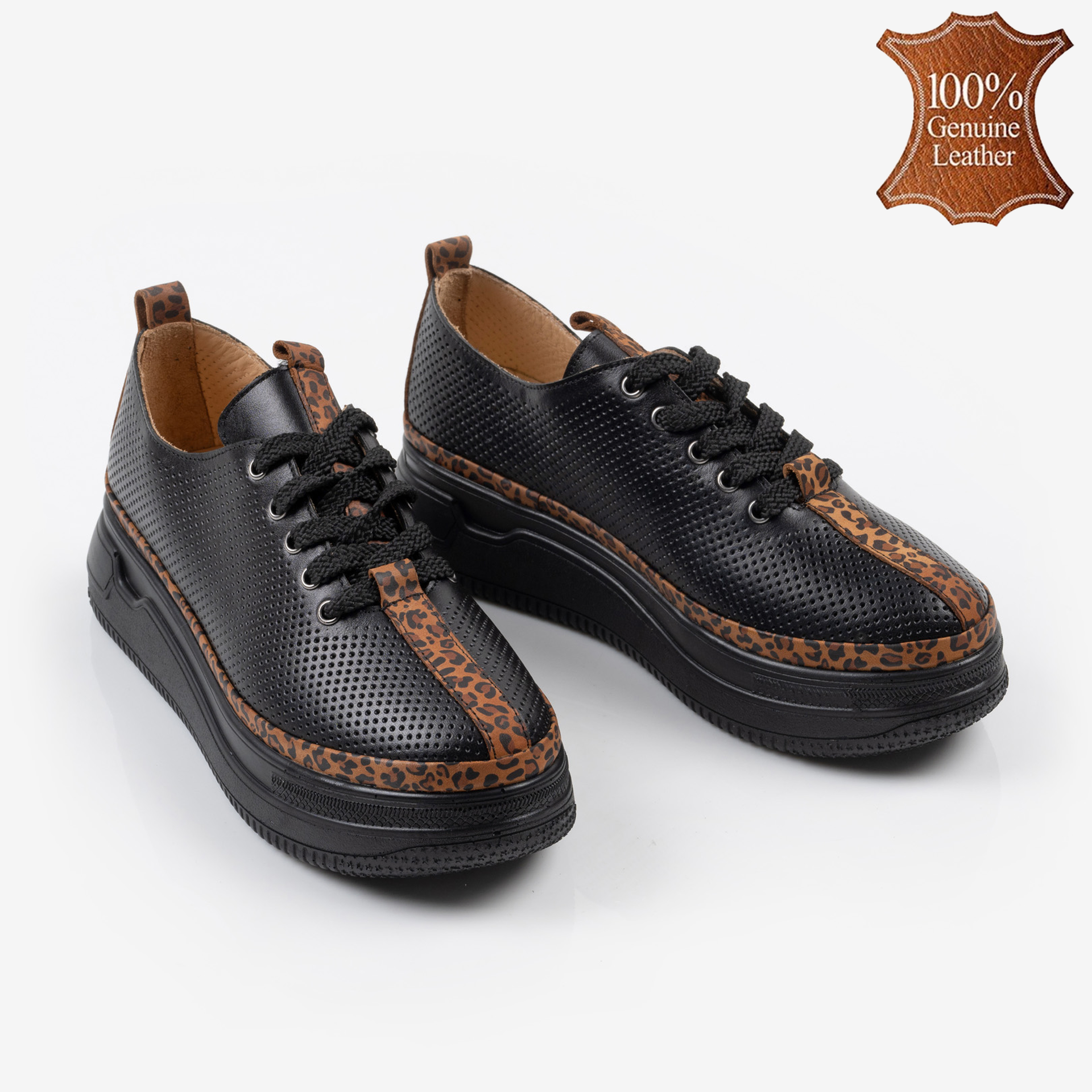 Когато черната естествена кожа срещне леопардовия принт, става ясно, че скучните обувки вече не са опция! Тези кецове не само изглеждат страхотно, но и дишат благодарение на стилната перфорация. С хастар от естествена кожа краката ви ще се чувстват като на облак, а вие – като кралица на уличния стил. Готови за приключения и комплименти? Ето ги вашите нови любими обувки!