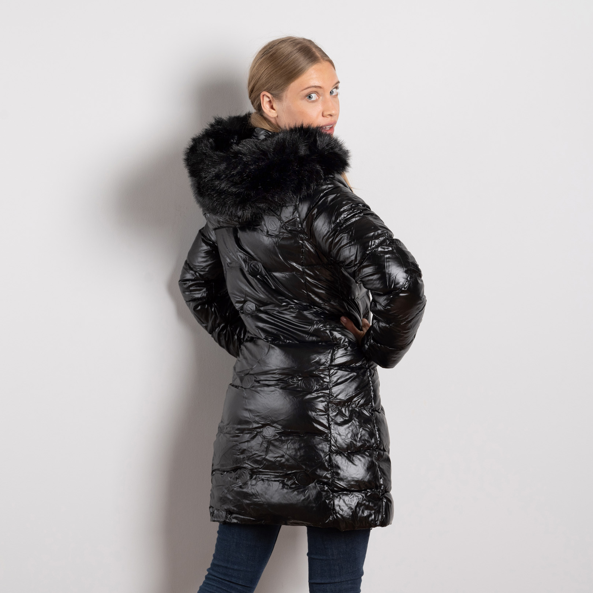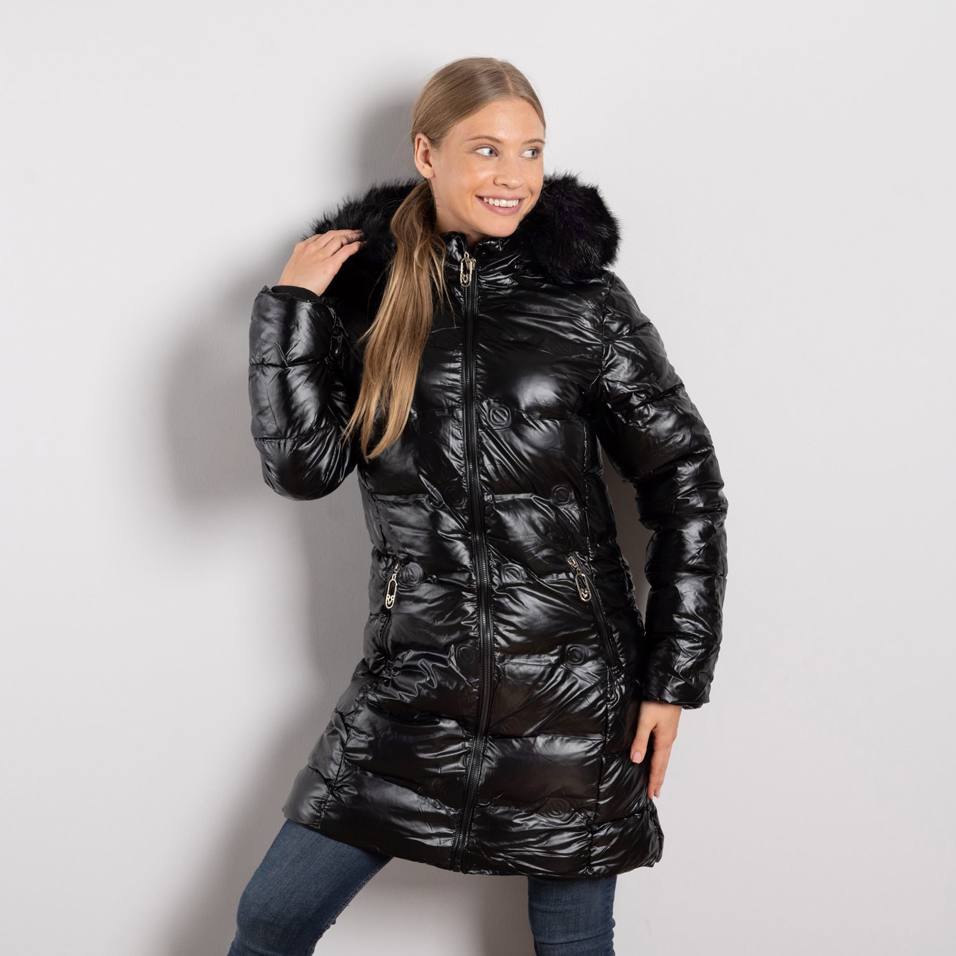 Дамско дълго ватирано зимно яке в цвят черно с махаща се качулка и пух – модел Sдо2XL