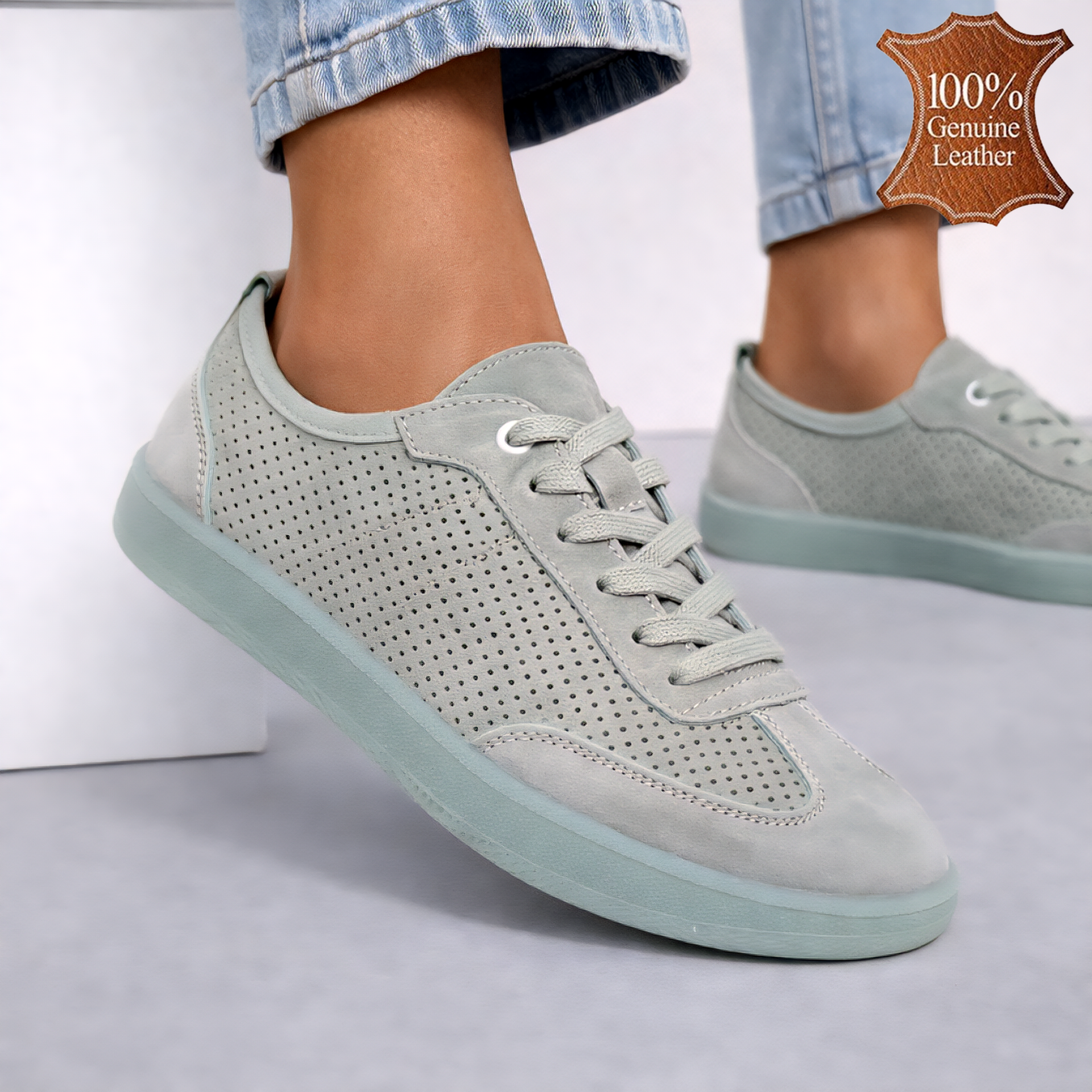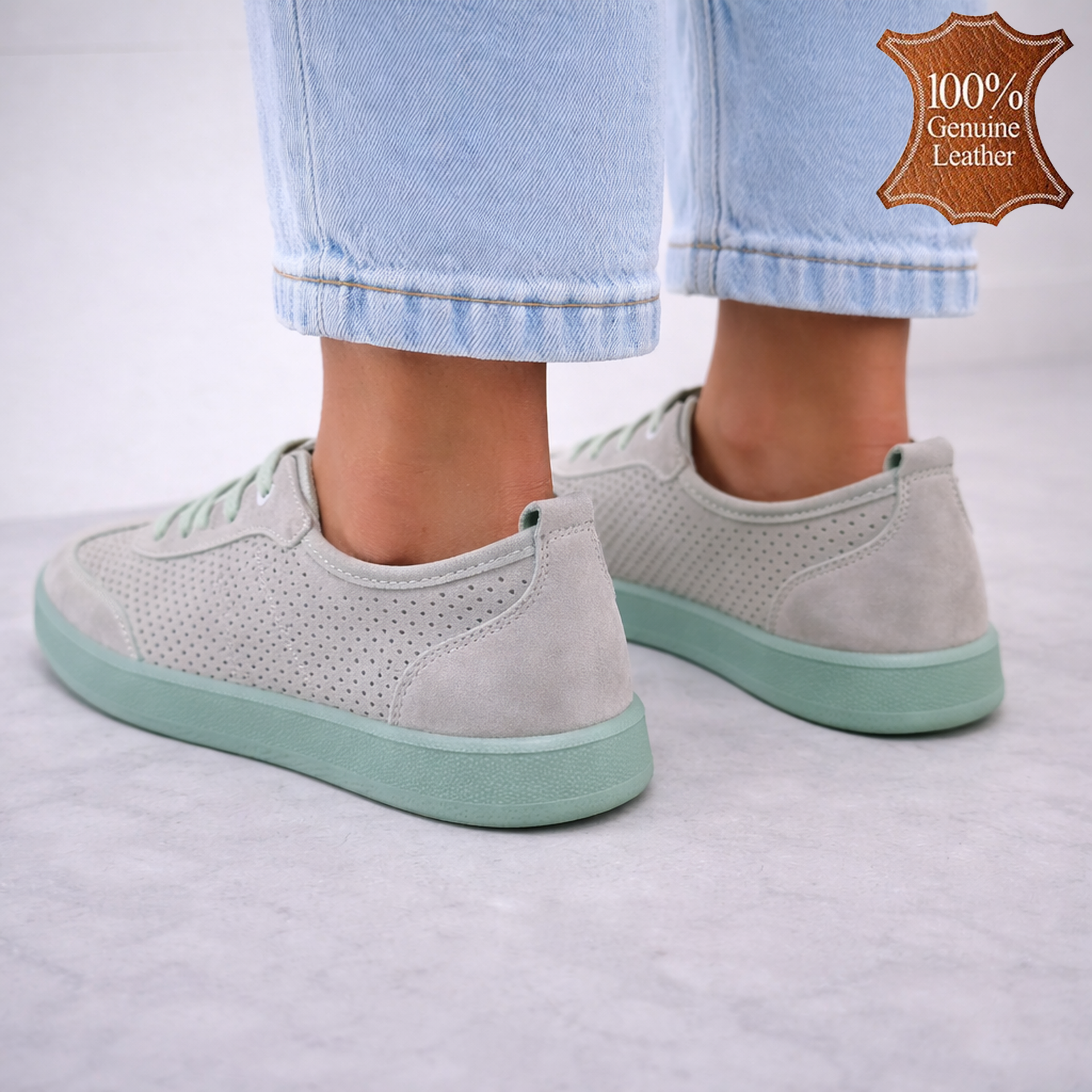 Ако зеленият цвят е настроението ви за деня, тези обувки са като свежа глътка въздух за краката! Мекота, която прегръща стъпалата ви, и перфорацията, която казва „поздрави, лято!“ – всичко това върху естествена кожа, която се грижи за комфорта ви. Изобретателите на удобството са се постарали, а вие само трябва да си ги обуете и да разходите усмивката на краката си!