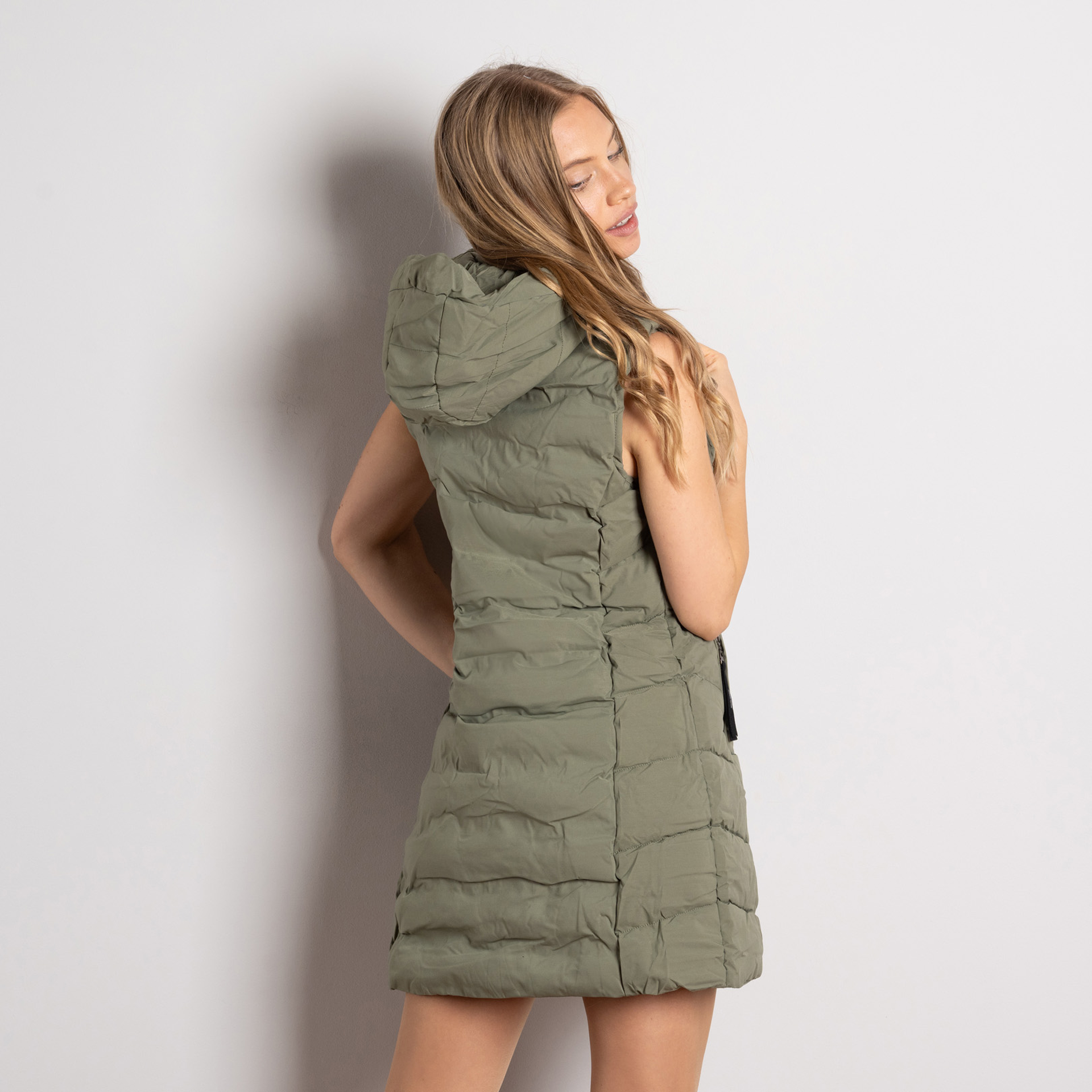 Когато искаш да си топла, уютна и стилна, но с малко свобода на движение – ето го твоят нов любим приятел! Това зелено ватирано елече е облаче, което те гушка, но без ръкави, за да можеш да правиш всичко – от дузина кафе до разходка с кучето. А ако решиш, че качулката не ти е нужна, просто я махни – нито капка излишна тежест! Изработено от мек и приятен текстил, който се грижи за комфорта ти през всеки сезон. Точно толкова практично, колкото и стилно – идеално за онези дни, когато не можеш да решиш дали да сложиш яке или не.
