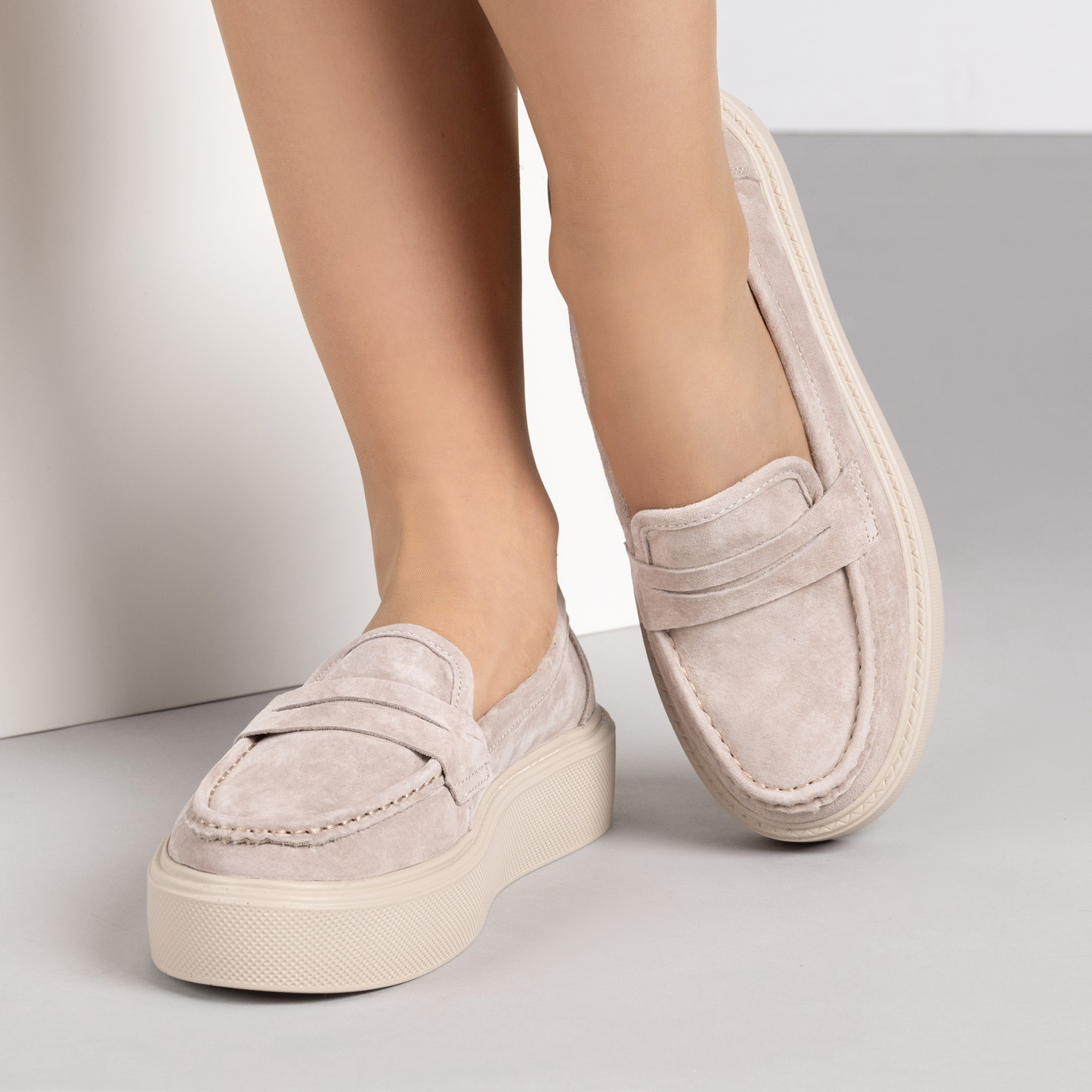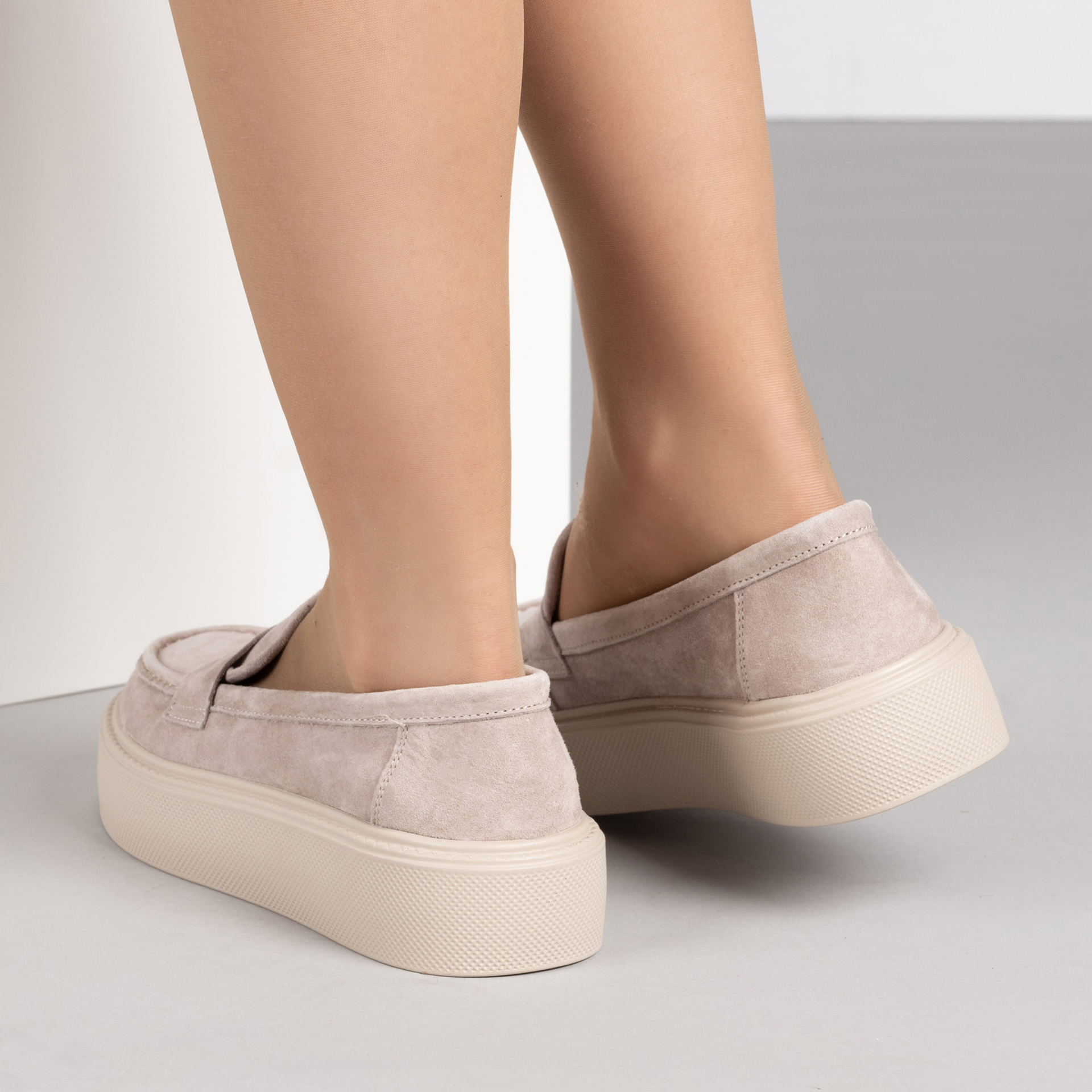 Изискани бежови дамски мокасини от естествен велур с дебела олекотена подметка