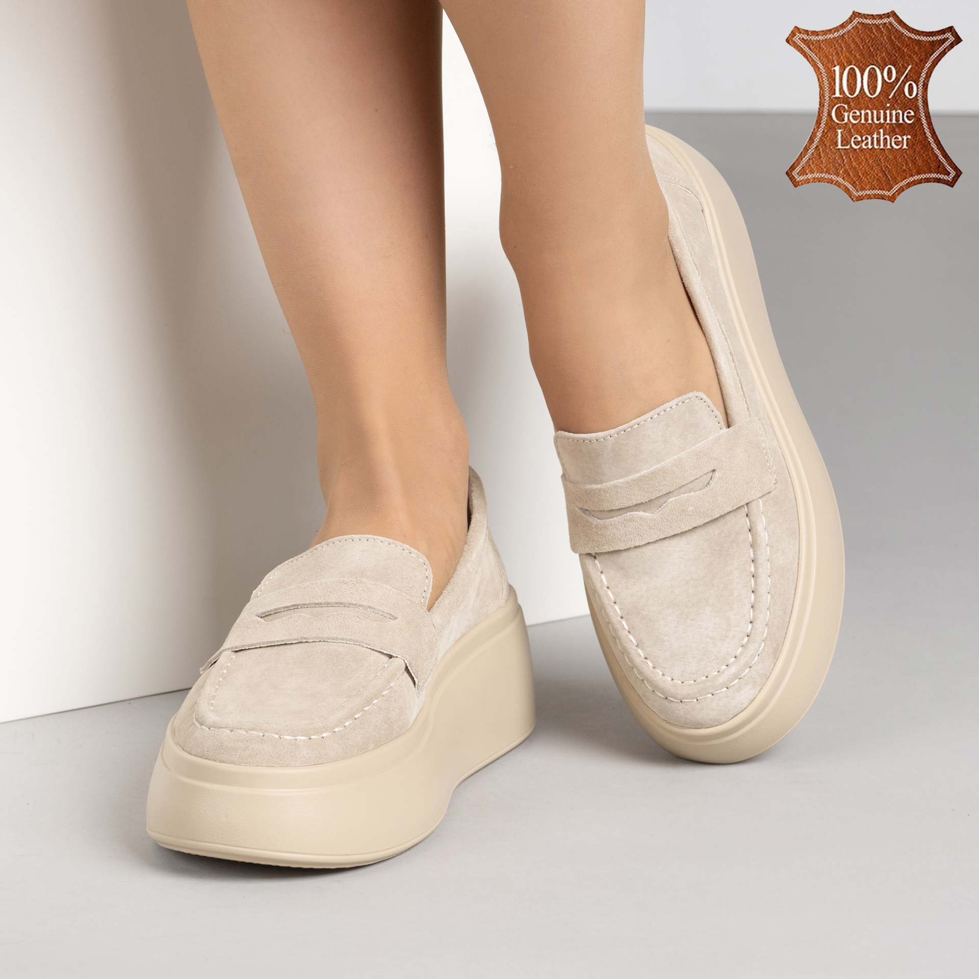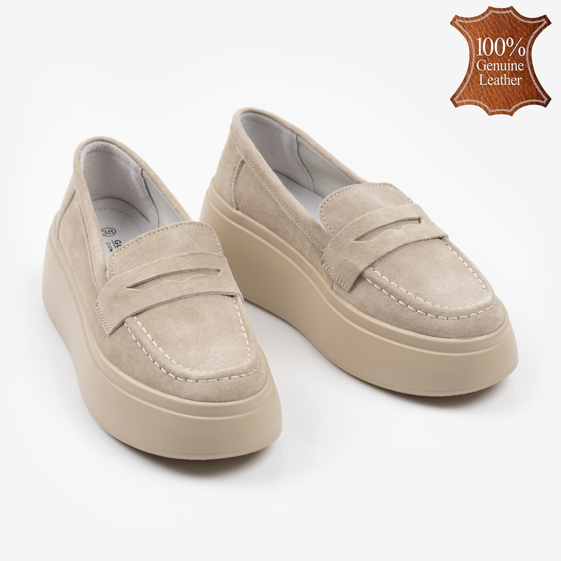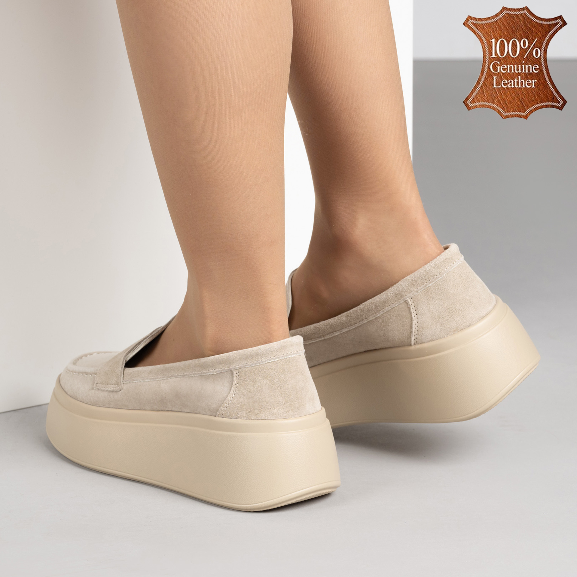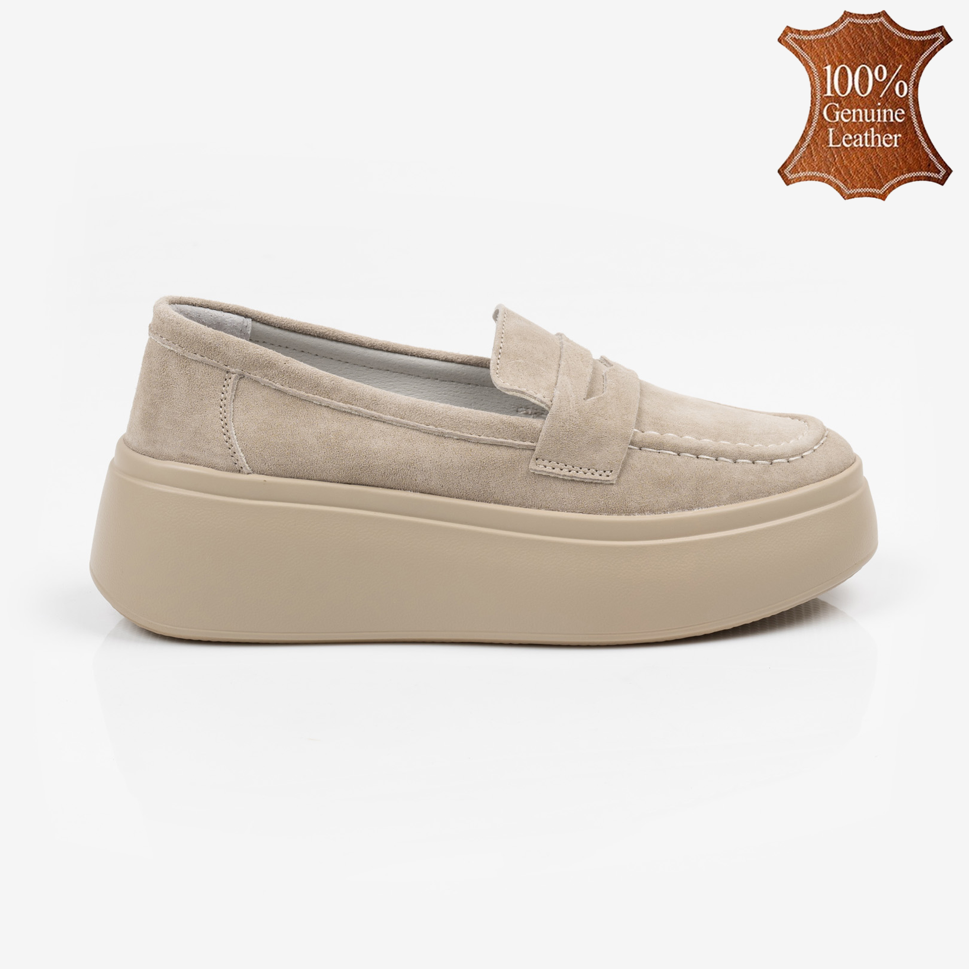 Изискани бежови дамски мокасини от естествен велур с дебела подметка