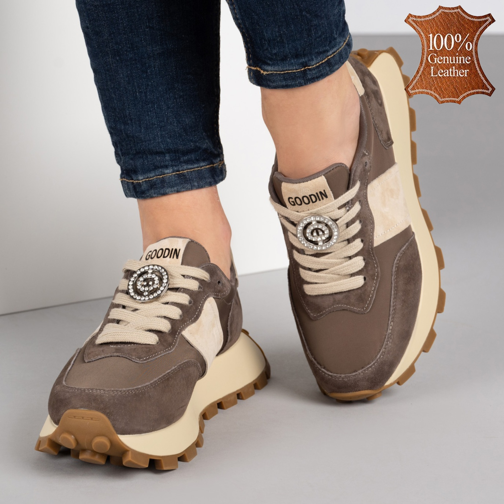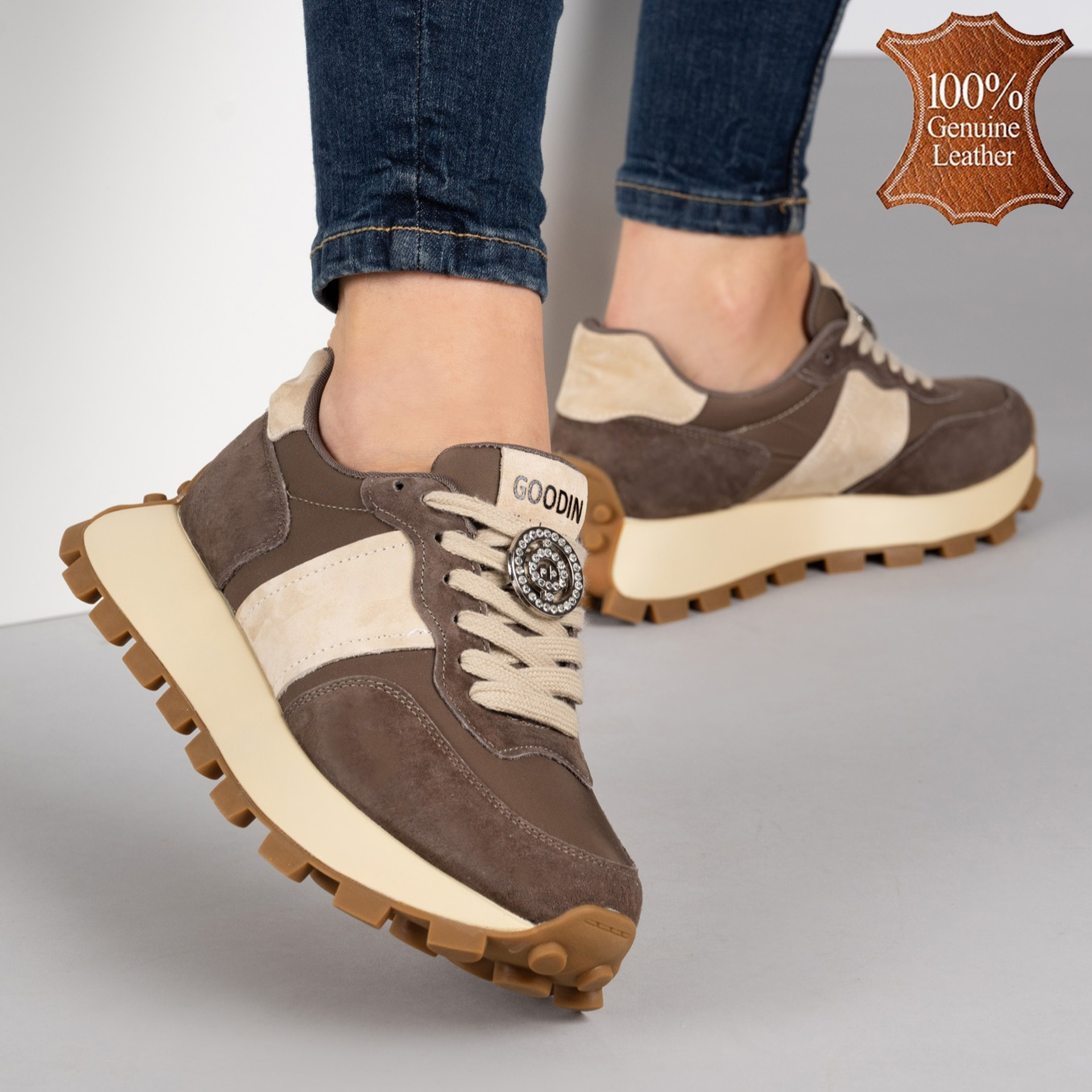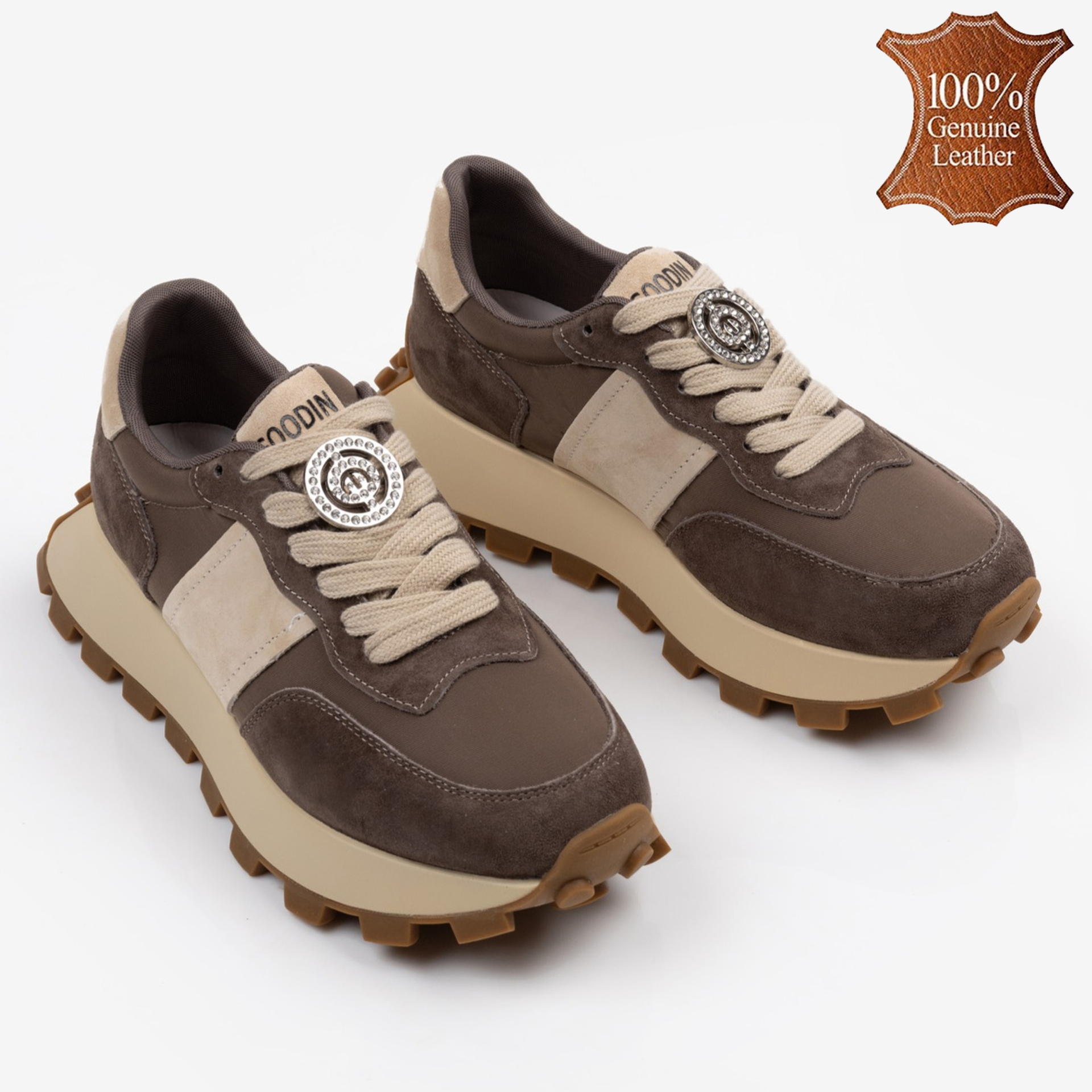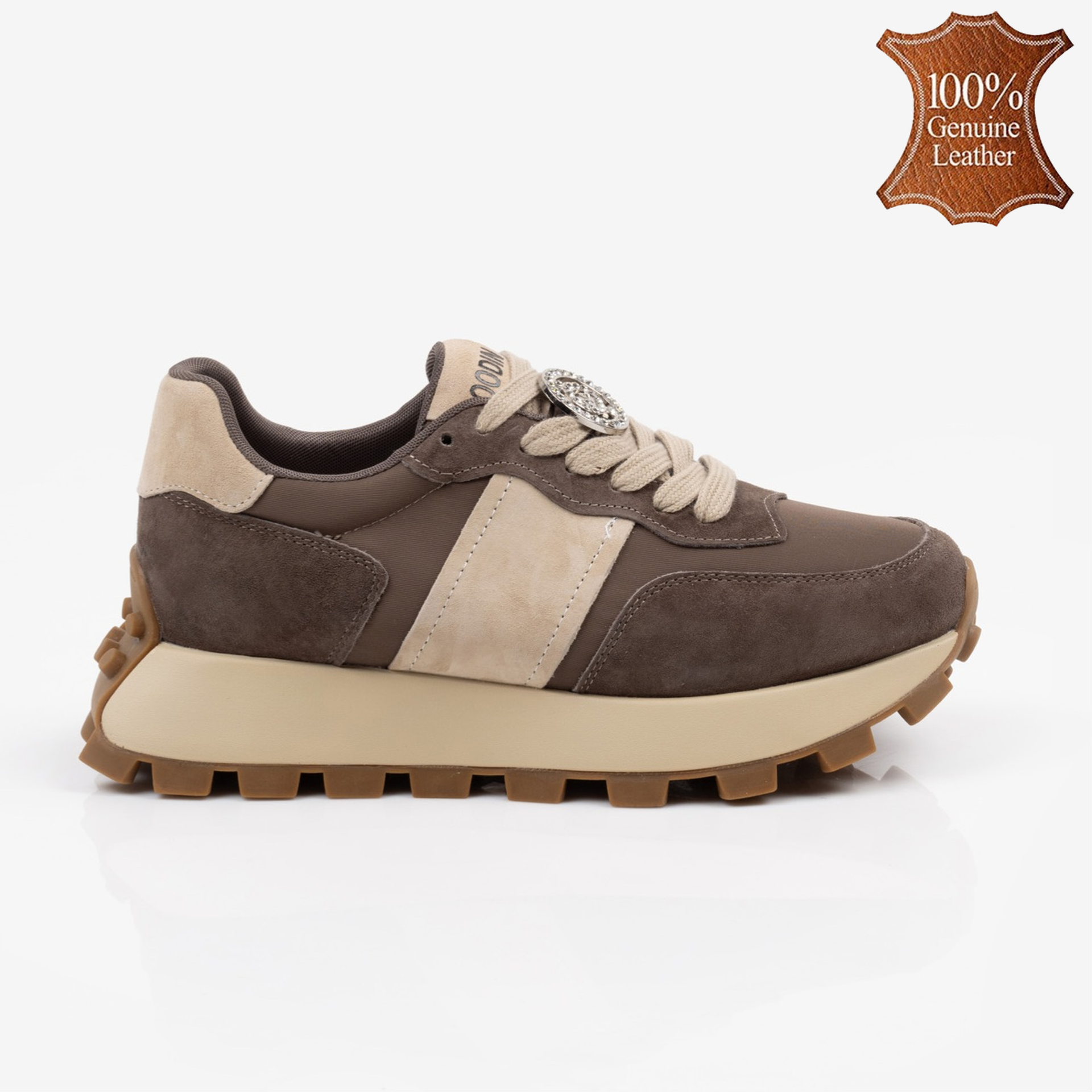 С тези кафяви дамски кецове от естествена кожа всеки ваш стъпка ще бъде комбинация от стил и комфорт! Дебелата подметка не само, че осигурява стабилност, но добавя и модерен акцент на визията ви. Златистите детайли блестят не само на слънце, но и в живота ви, придавайки нотка елегантност на ежедневните мутации. Комбинирайте ги с любимите дънки или рокля и бъдете готови за приключения! Сгответе на вашето крачно изкуство с кецовете, които не само ще ви накарат да се чувствате удобно, но и ще добавят изразителност на влагата. Подходящи за всякакви поводи, тези обувки са перфектният партньор за всяко начинание!