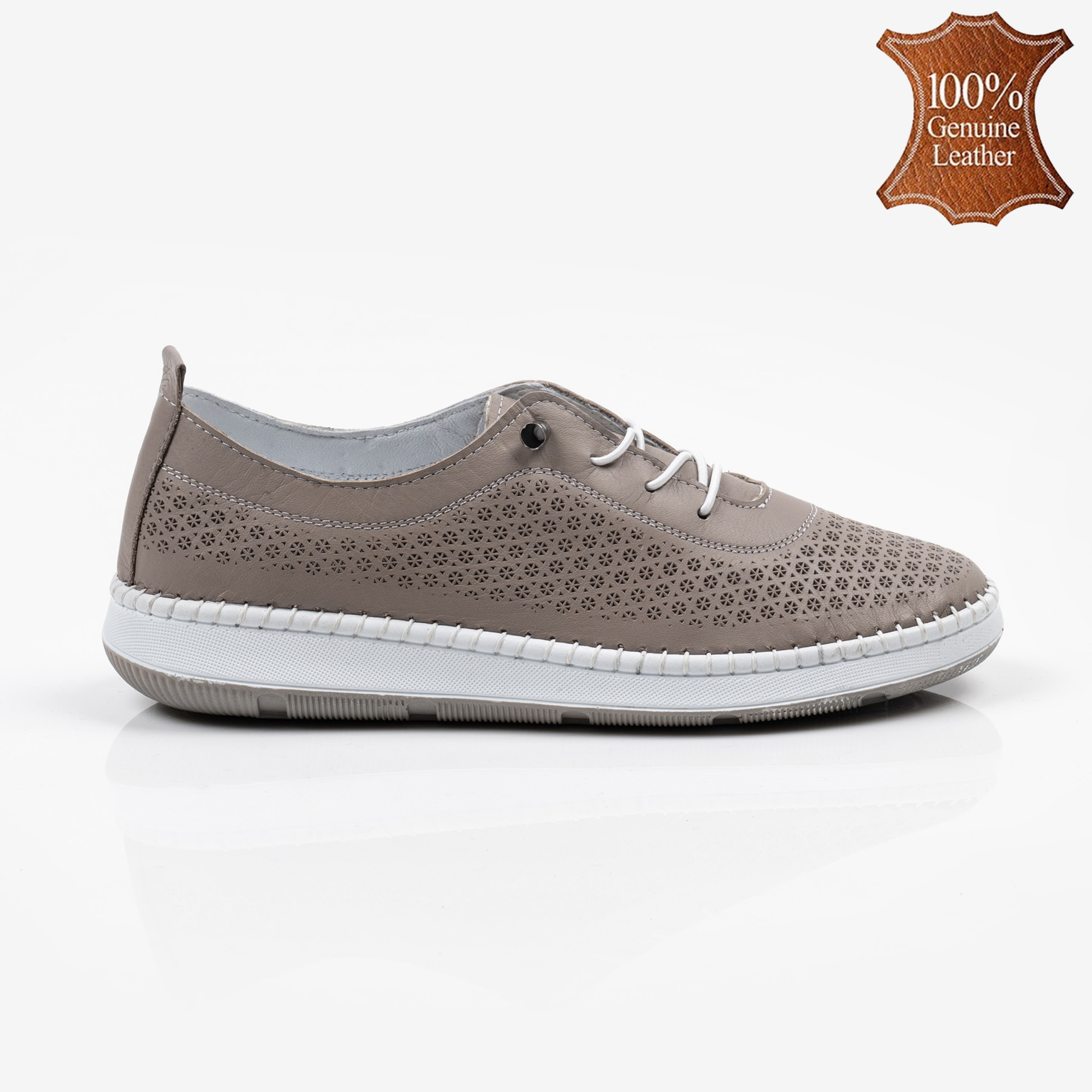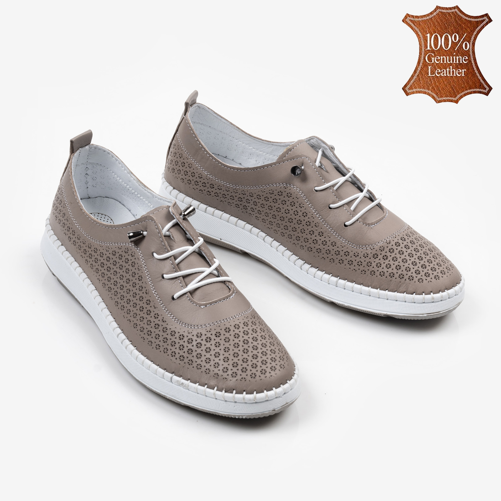 Кафяви дамски кожени обувки с ортопедично ходило, ластични връзки и декоративна перфорация