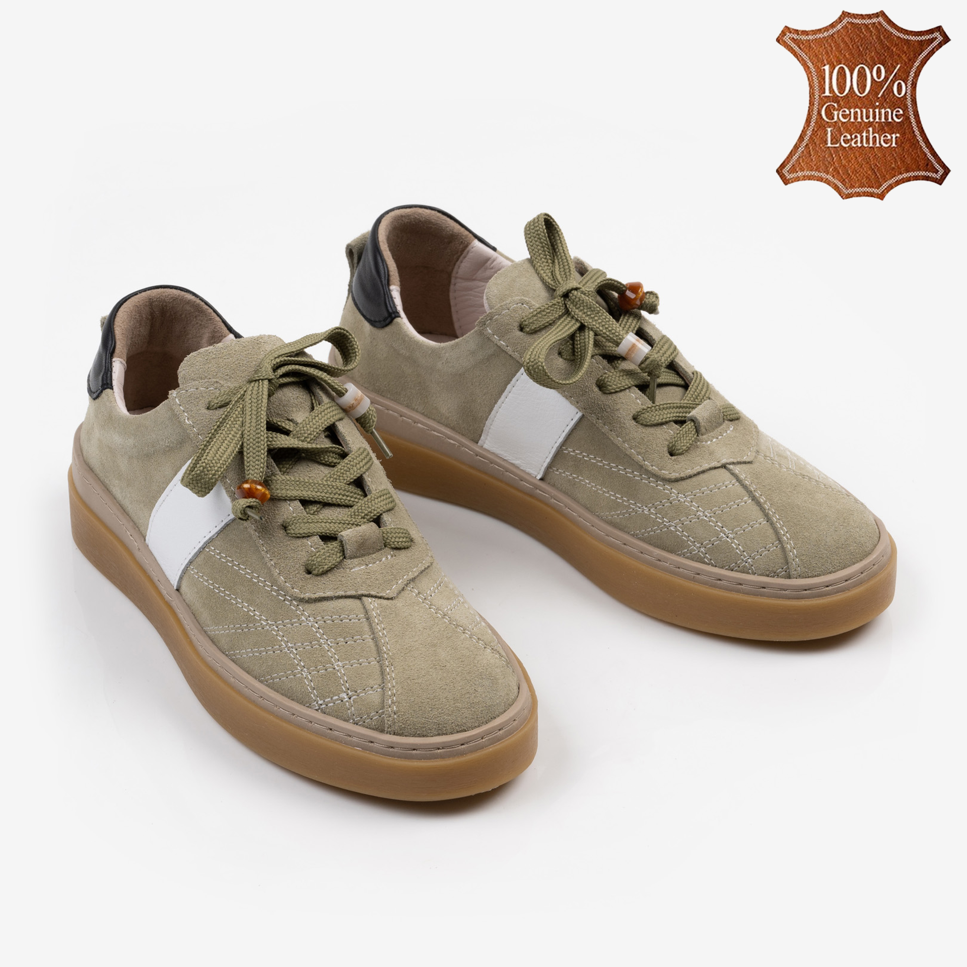 Комфортни дамски кецове в зелено от естествена кожа с шита подметка