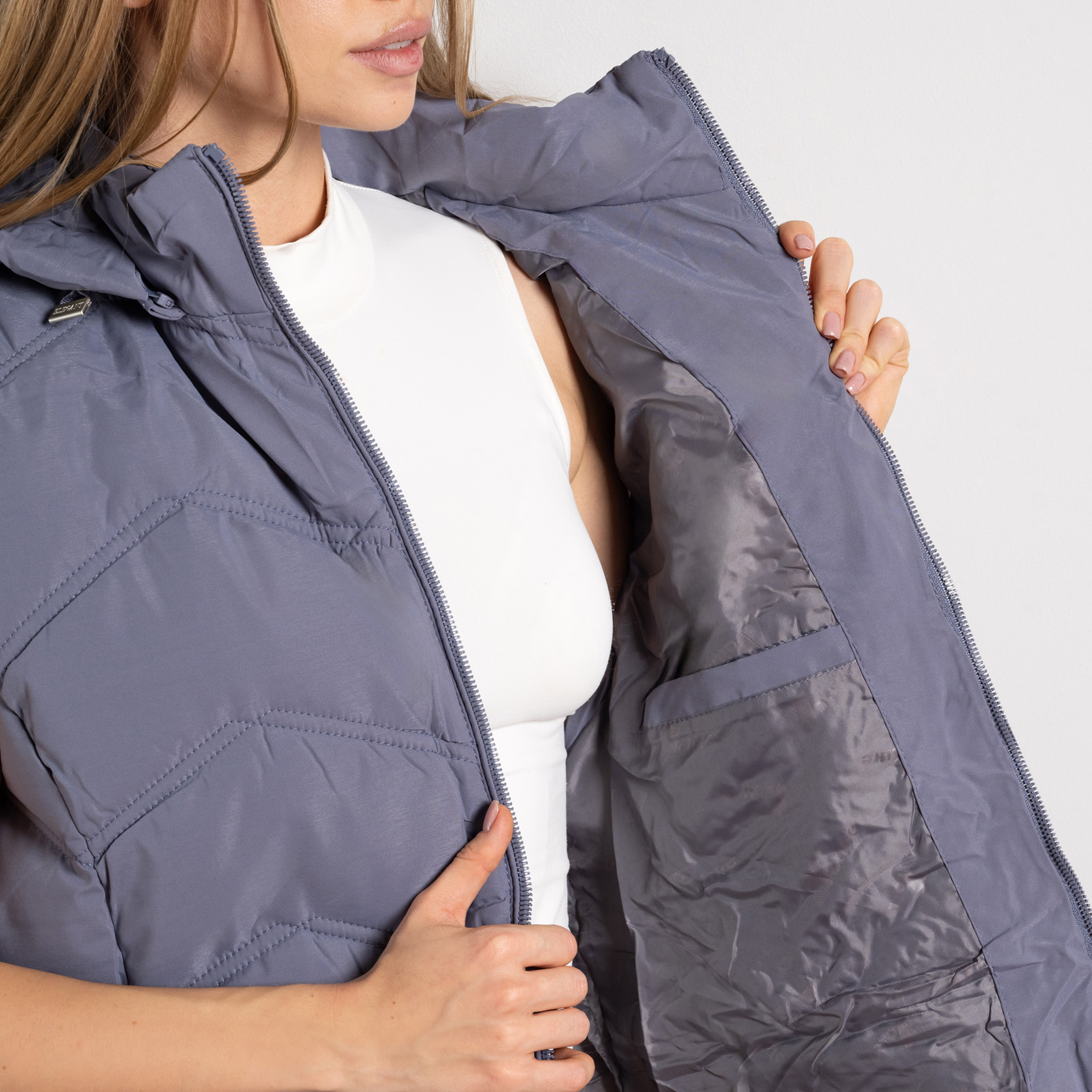 Когато студът започне да шепне топли се, тази пухкава и стилна приятелка е тук, за да ви спаси! Лилавото ватирано елече с махаща се качулка и хитри декоративни копчета отстрани не само пази прохладата далеч, но и гарантира, че ще изглеждате страхотно дори в най-студените дни. А текстилната материя е толкова удобна, че ще искате да я носите цял ден – дори когато времето е решило да се чуди дали да бъде зимно или пролетно. Пригответе се за модна игра със стила и топлината!