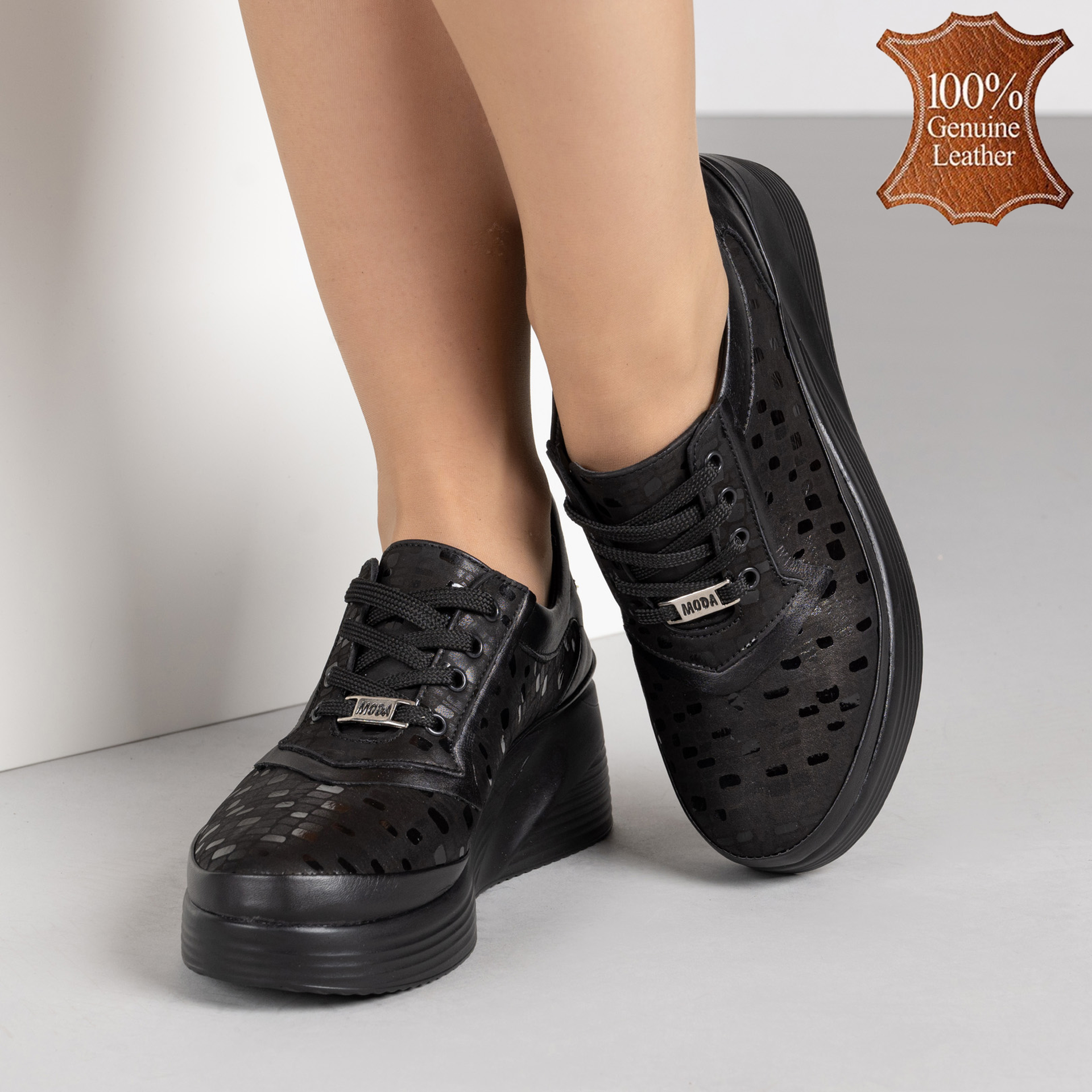 Модерни черни дамски обувки от естествена кожа с релефна текстура и олекотена платформа