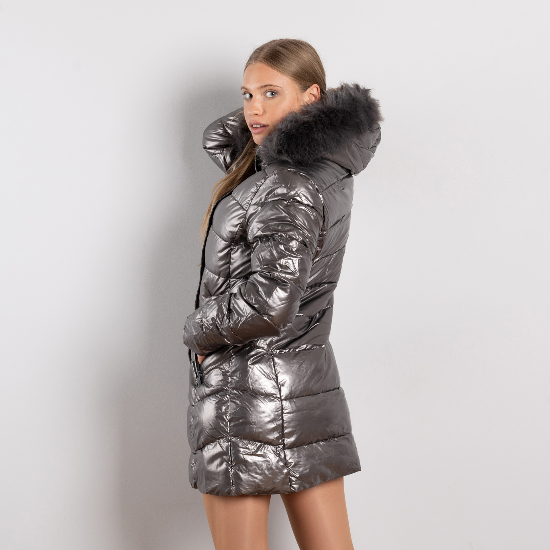Сребристо дамско дълго ватирано зимно яке с пух и блясък – модел Sдо2XL