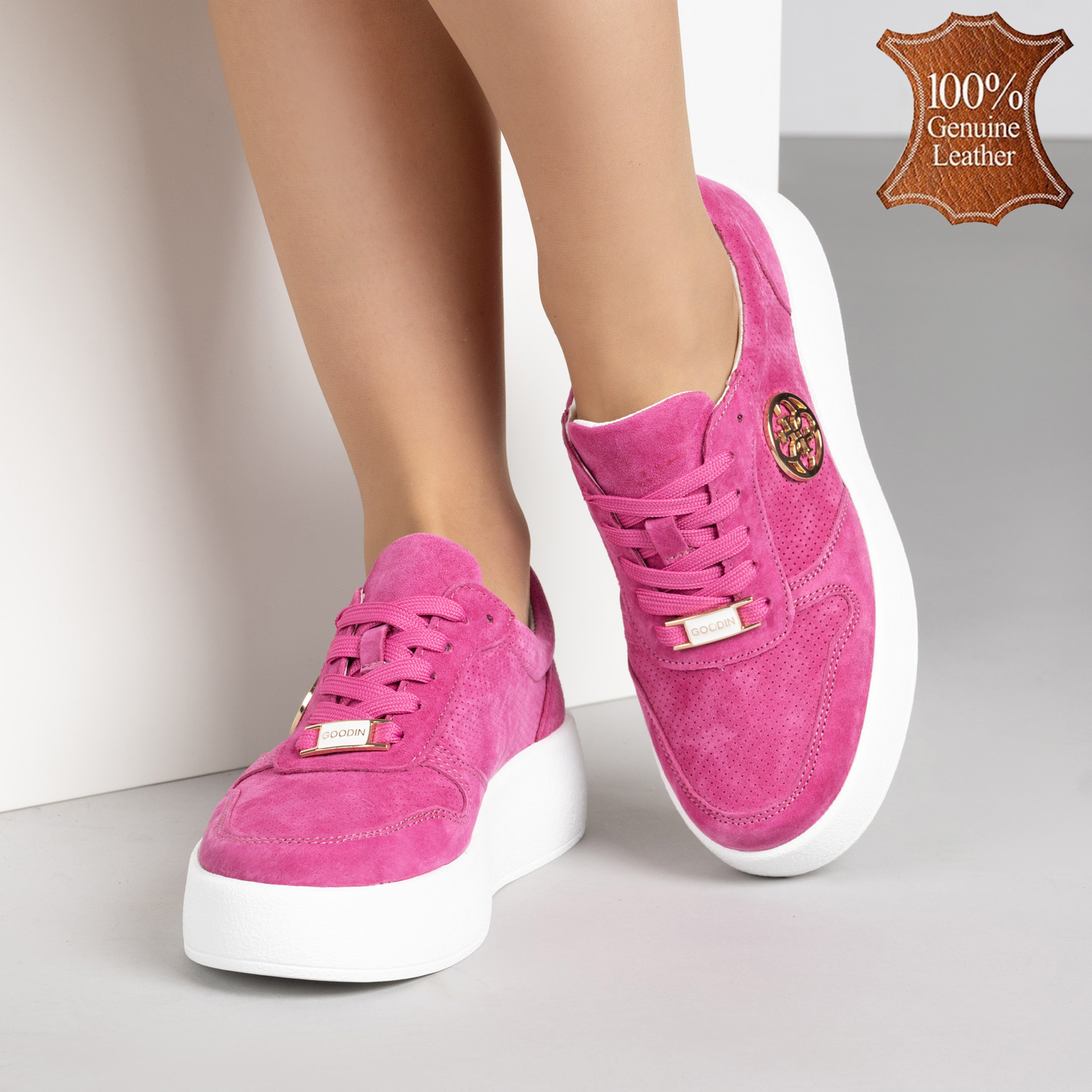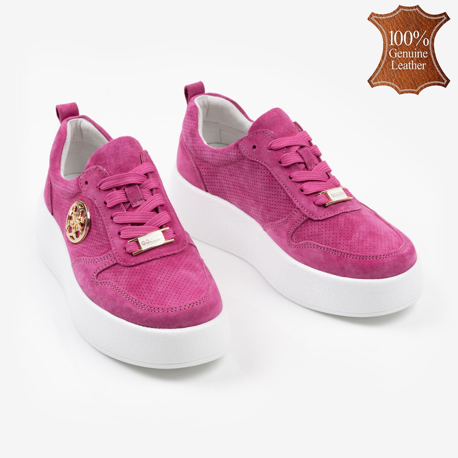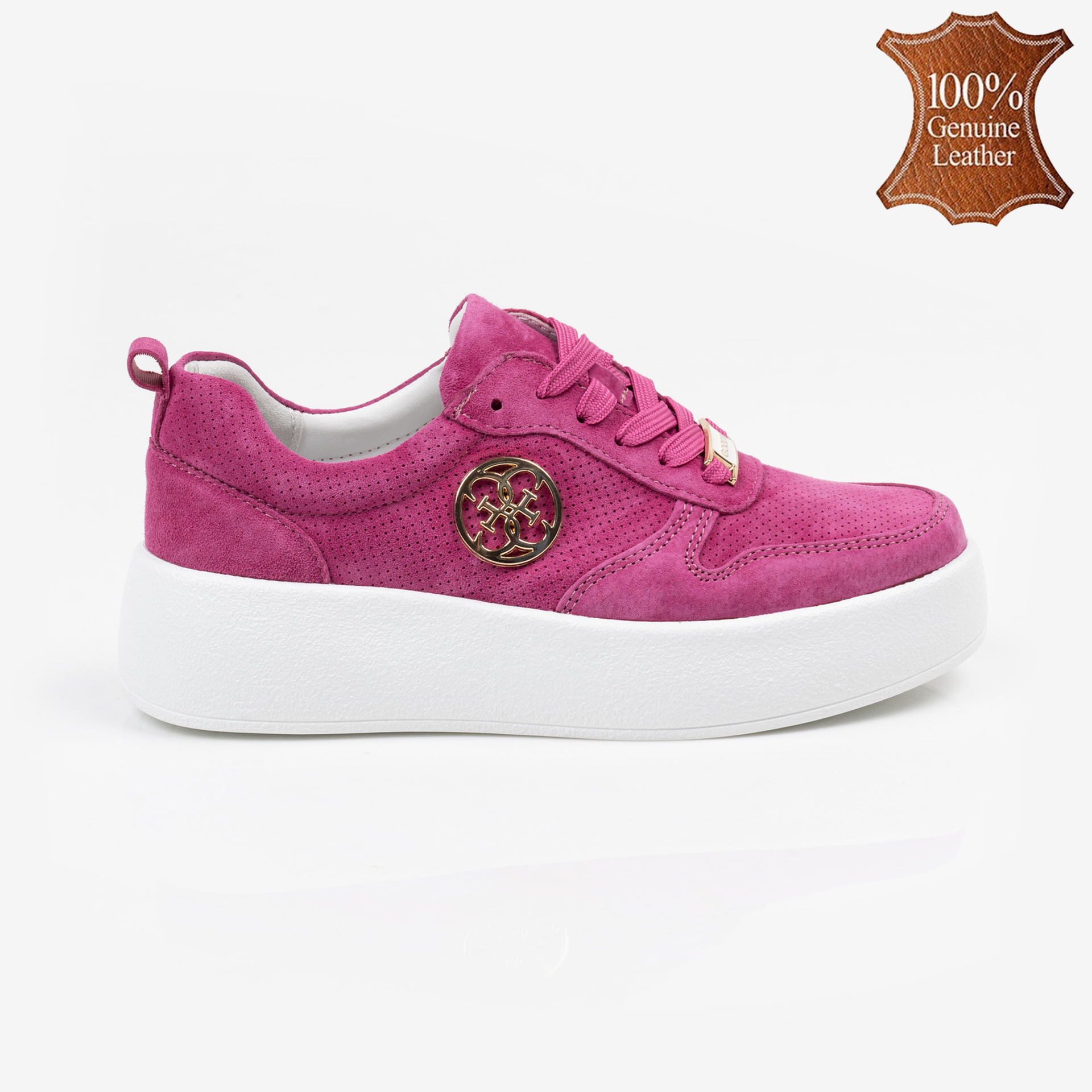 Цикламени дамски обувки от естествена кожа с олекотена подметка и златиста катарама