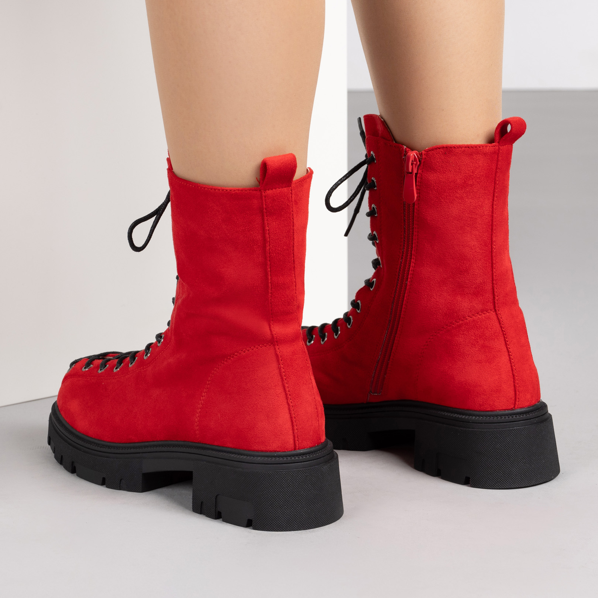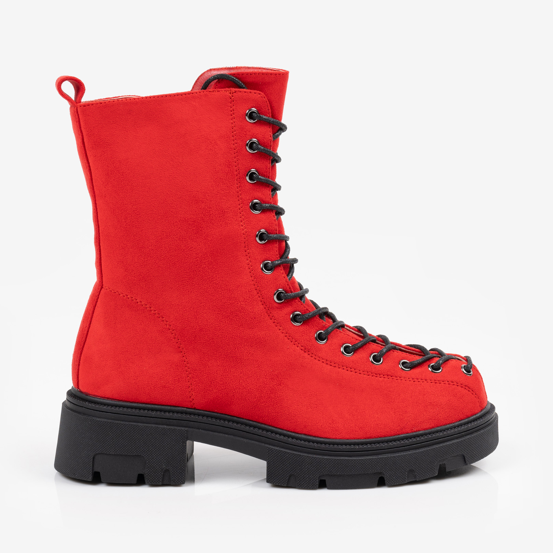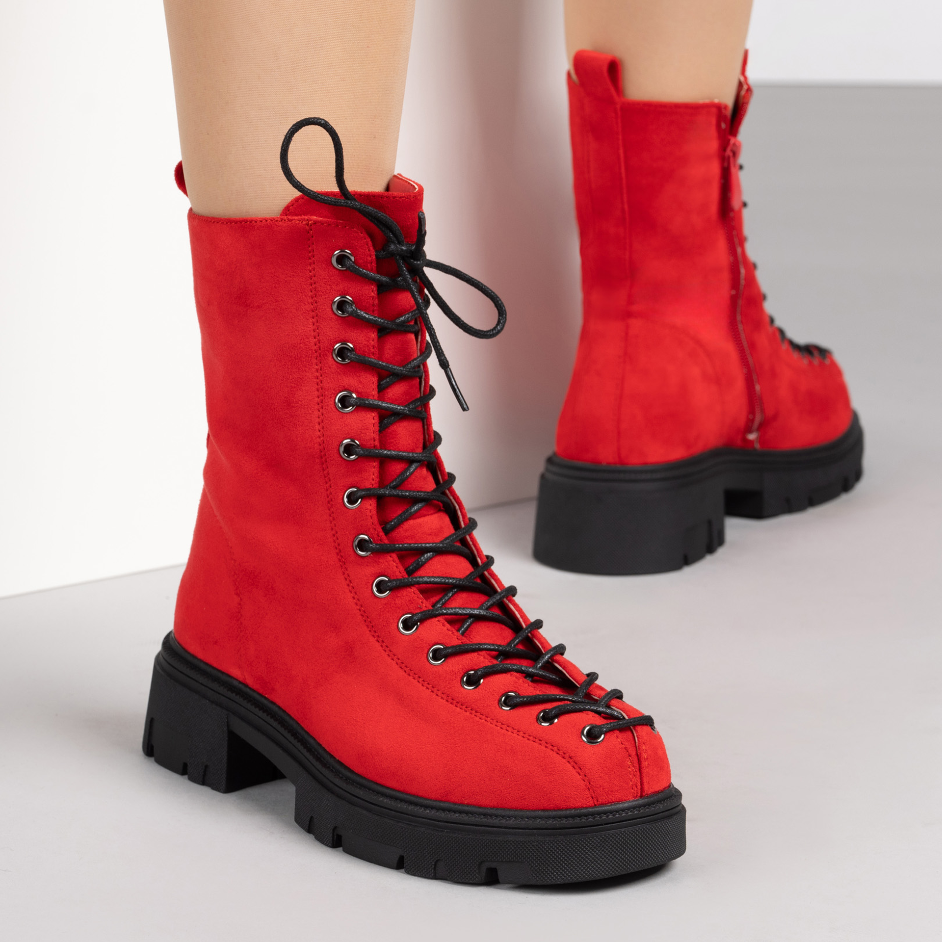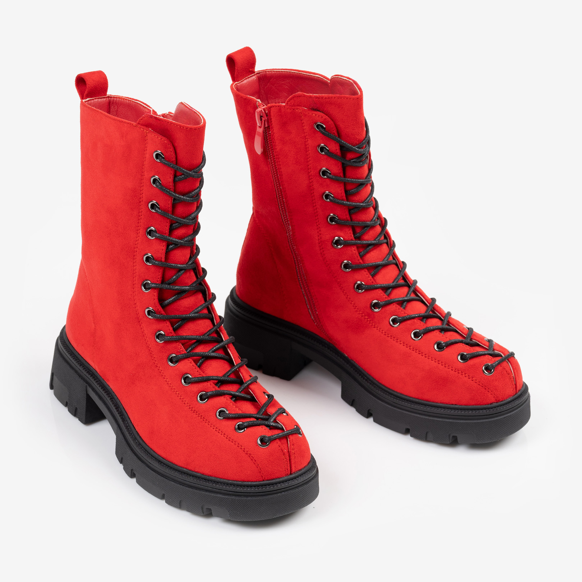 Червени дамски боти с връзки и грайферна подметка