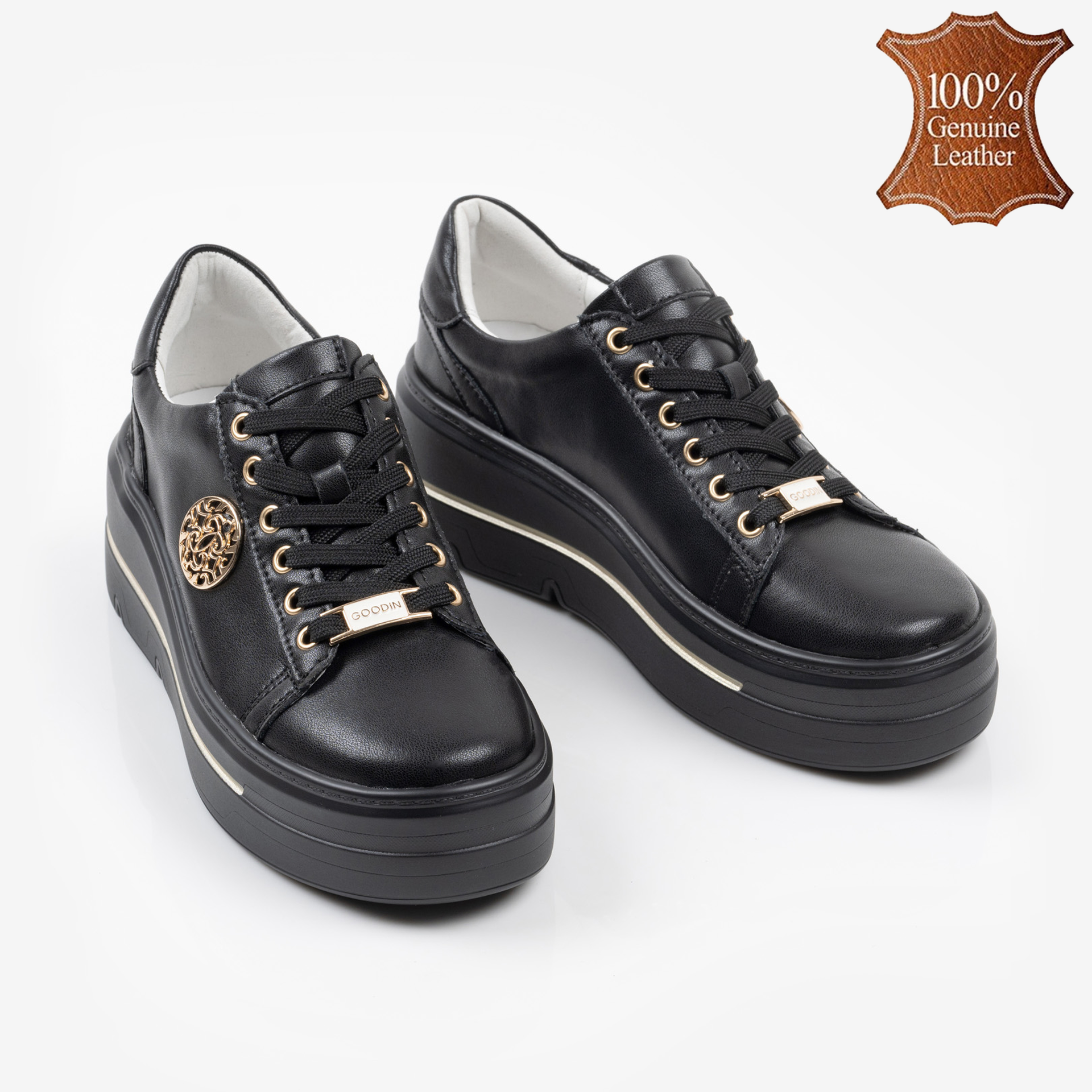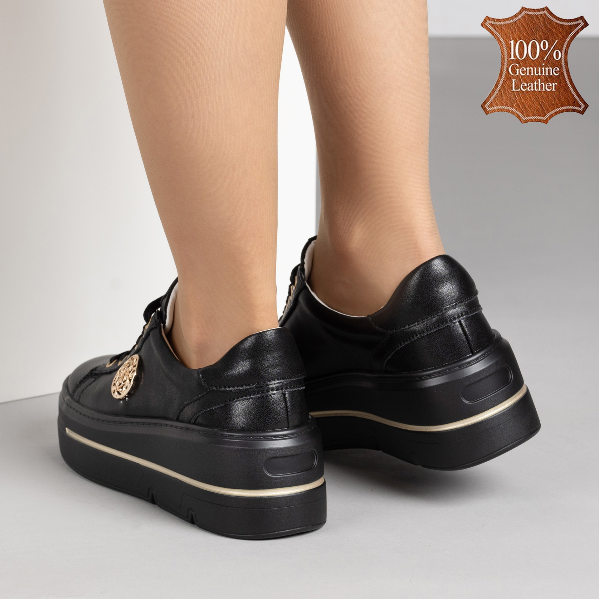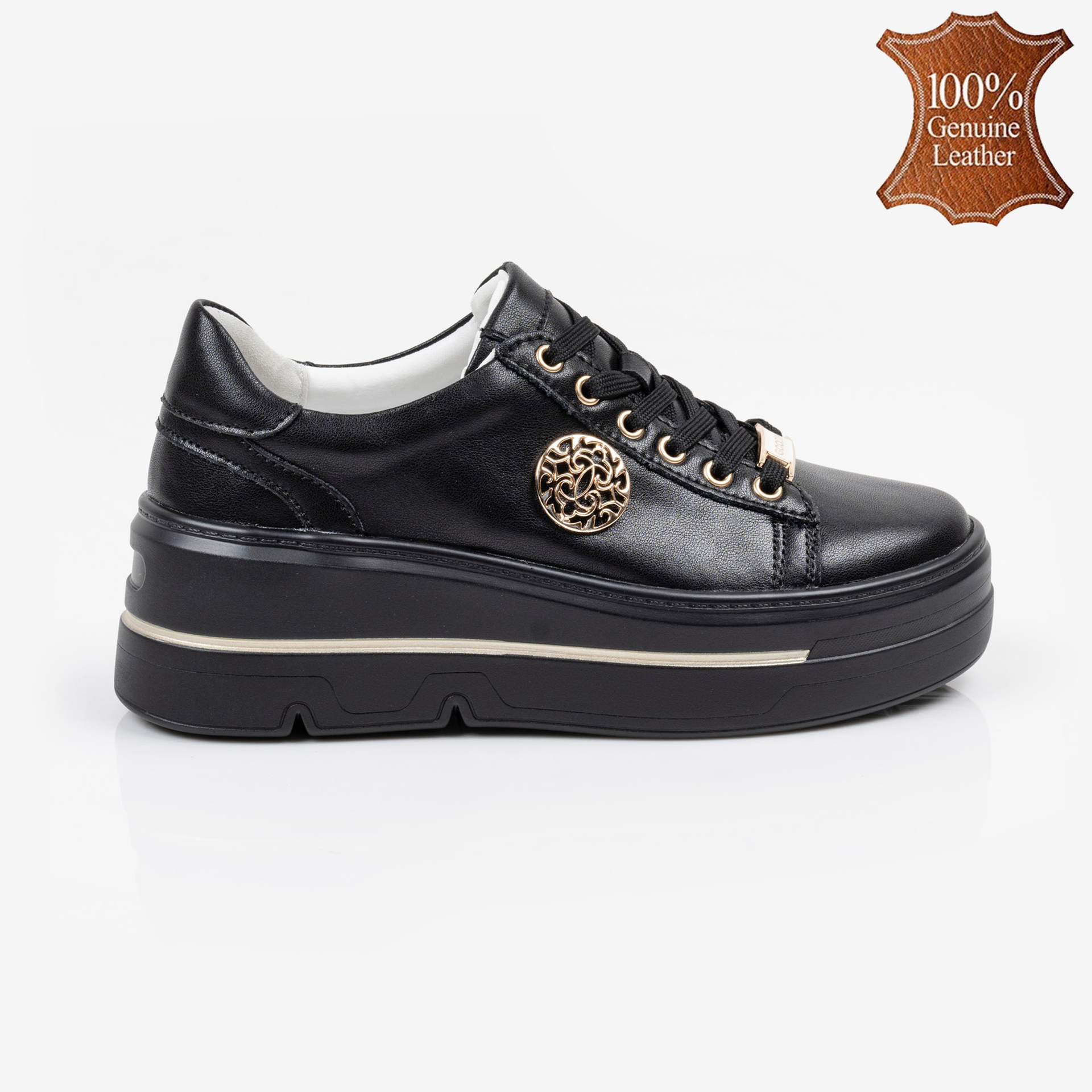 Черни дамски обувки от естествена кожа със златисти орнаменти и олекотена подметка