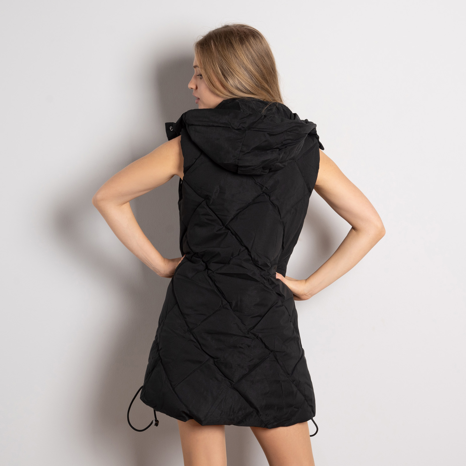 Черно дамско ватирано елече със сваляща се качулка и модерна визия