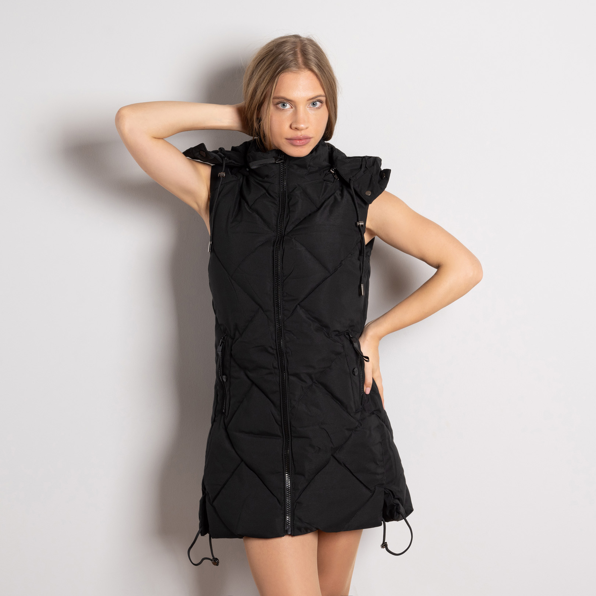 Когато времето реши да е толкова непредсказуемо, колкото ти самата, това черно ватирано елече влиза в играта! Свалящата се качулка е като магическа шапка – без значение дали вали, духа или просто искаш да си супер стилна, то е винаги на линия. Водоустойчивият шушляк гарантира, че дъждовните капки ще те заобиколят, а модерната визия ще събира погледи и комплименти. Комфорт, топлина и доза непокорност – да, точно това ти трябва в гардероба!