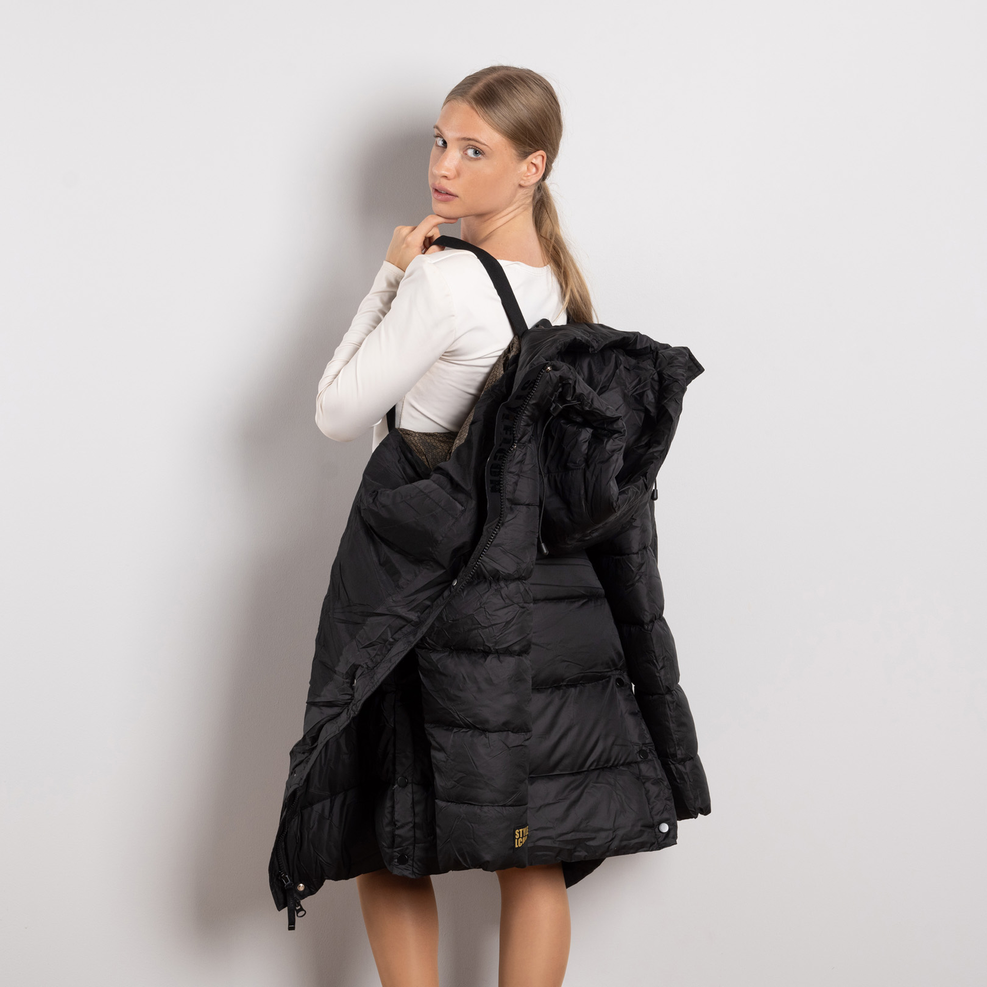 Черно дамско зимно яке до коляното с качулка и връзки – ватиран модел Sдо2XL