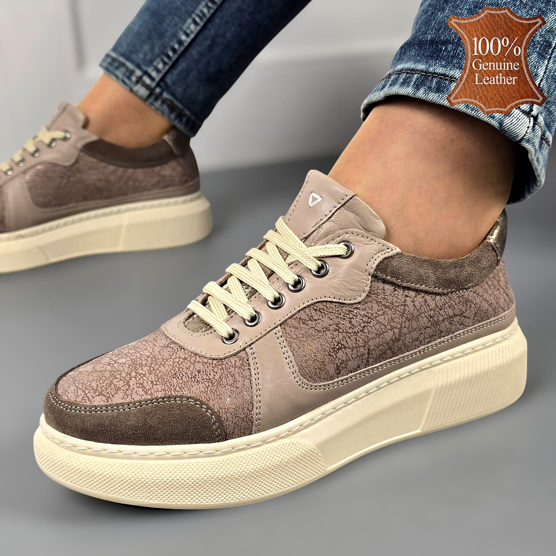 Представяме ви един вълшебен букет от стил и комфорт! Тези шикозни дамски бежови кецове са истински моден шедьовър, изработени от естествена кожа, която не само радва окото, но и обгръща крака с неустоима мекота. Модерната кожена апликация добавя нотка индивидуалност, а олекотеното ходило с шита подметка прави всяка крачка удоволствие.